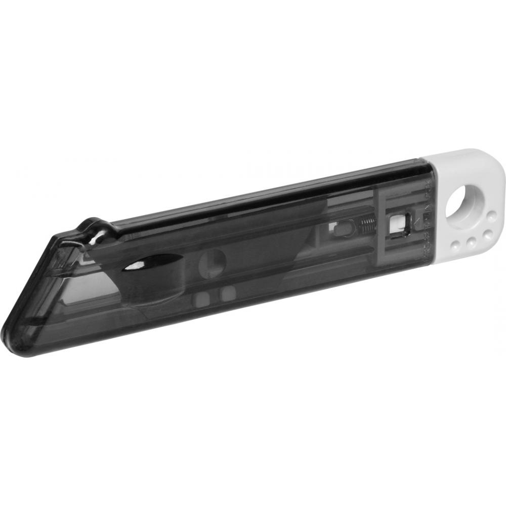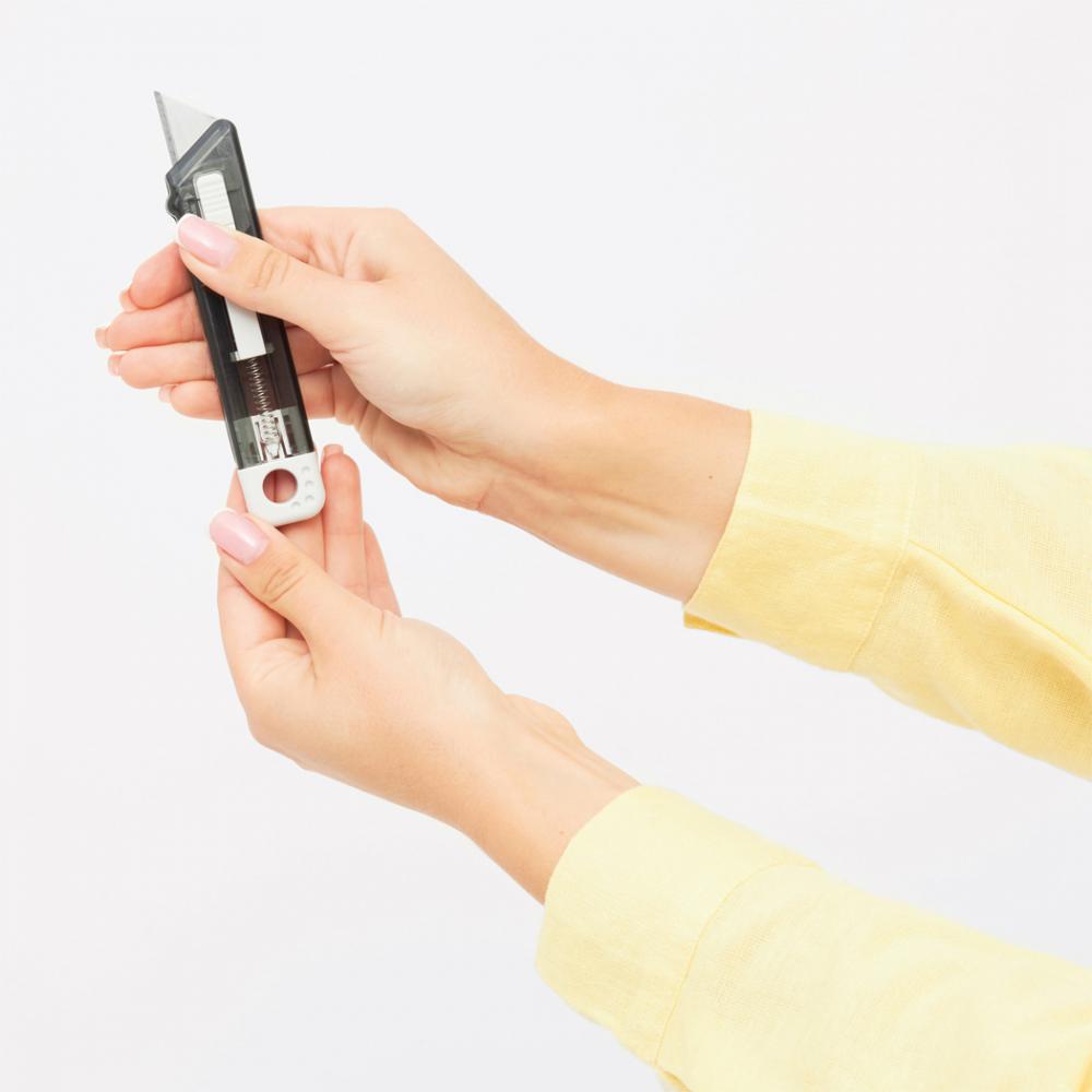 Нож-резак SLIDE IT: механизм скольжения с пружиной, сменное лезвие, цветной пластиковый корпус с петлей для подвешивания на конце рукоятки.