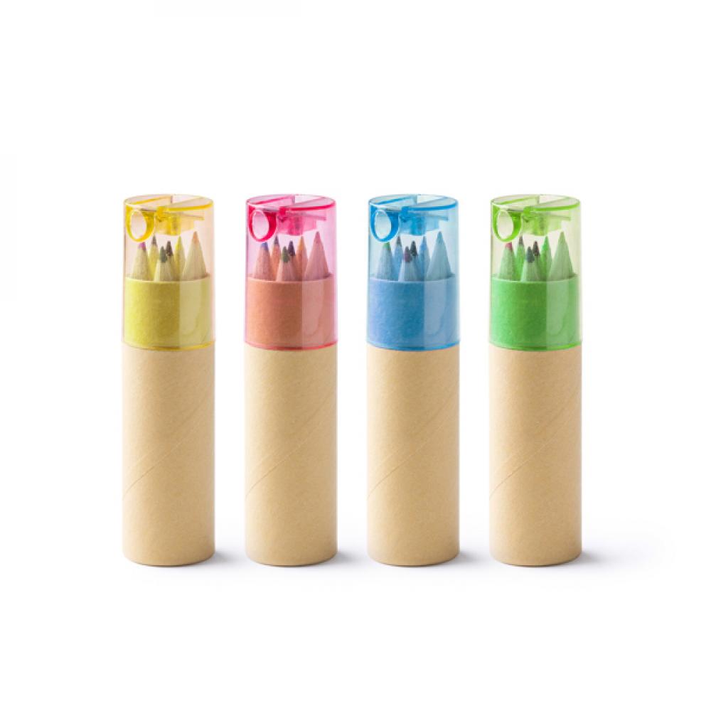 Деревянный набор из 6 карандашей в картонной упаковке с прозрачной цветной крышкой. Встроенная заточка в крышке. Доступно в разных цветах.