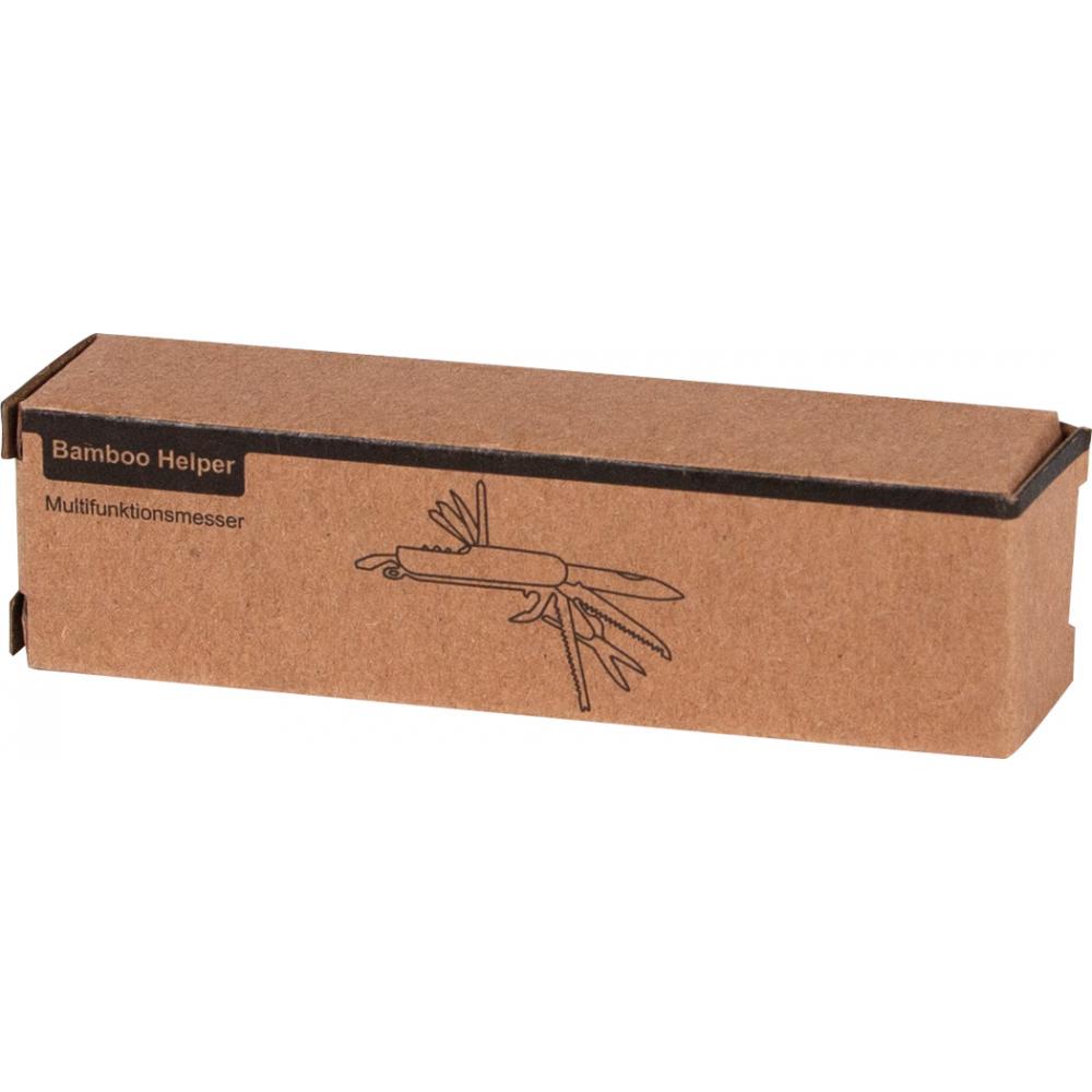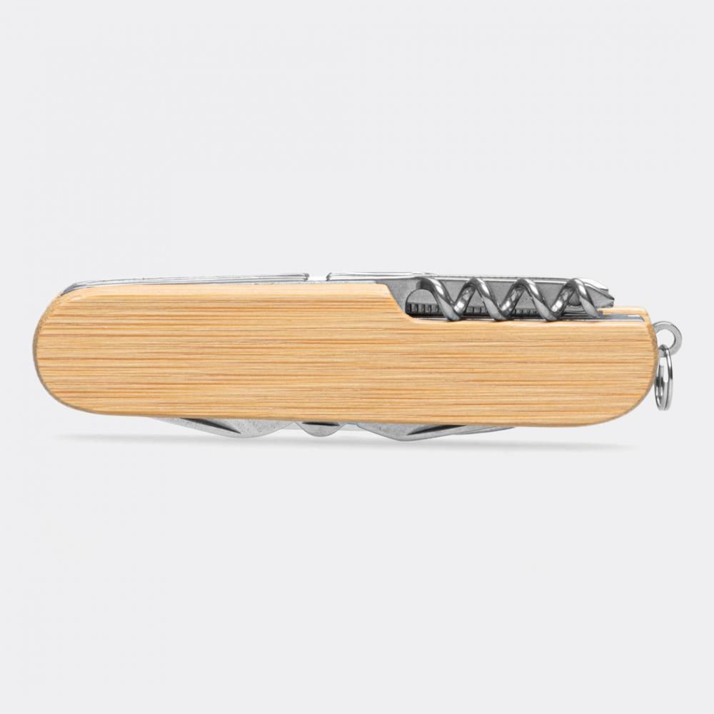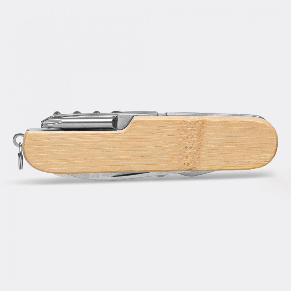 Карманный нож BAMBOO HELPER 11 частей: ножницы, большая пила, маленькая пила, нож, консервный нож, открывалка для бутылок, штопор, шило, напильник, дырокол и крестовая отвертка, вкл. кольцо для ключей. Нож изготовлен из нержавеющей стали с бамбуковой ручкой