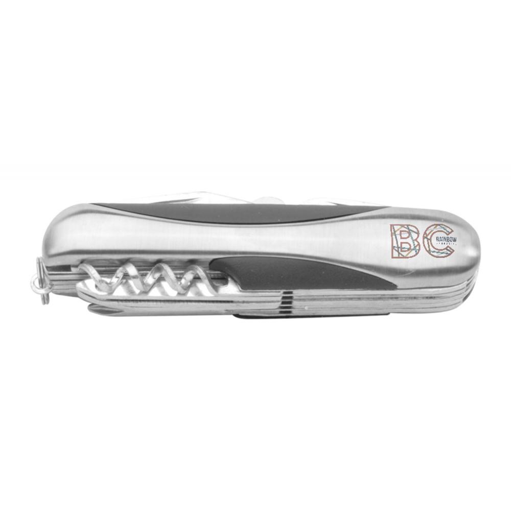 Металлический карманный нож с 11 функциями и пластиковой вставкой.