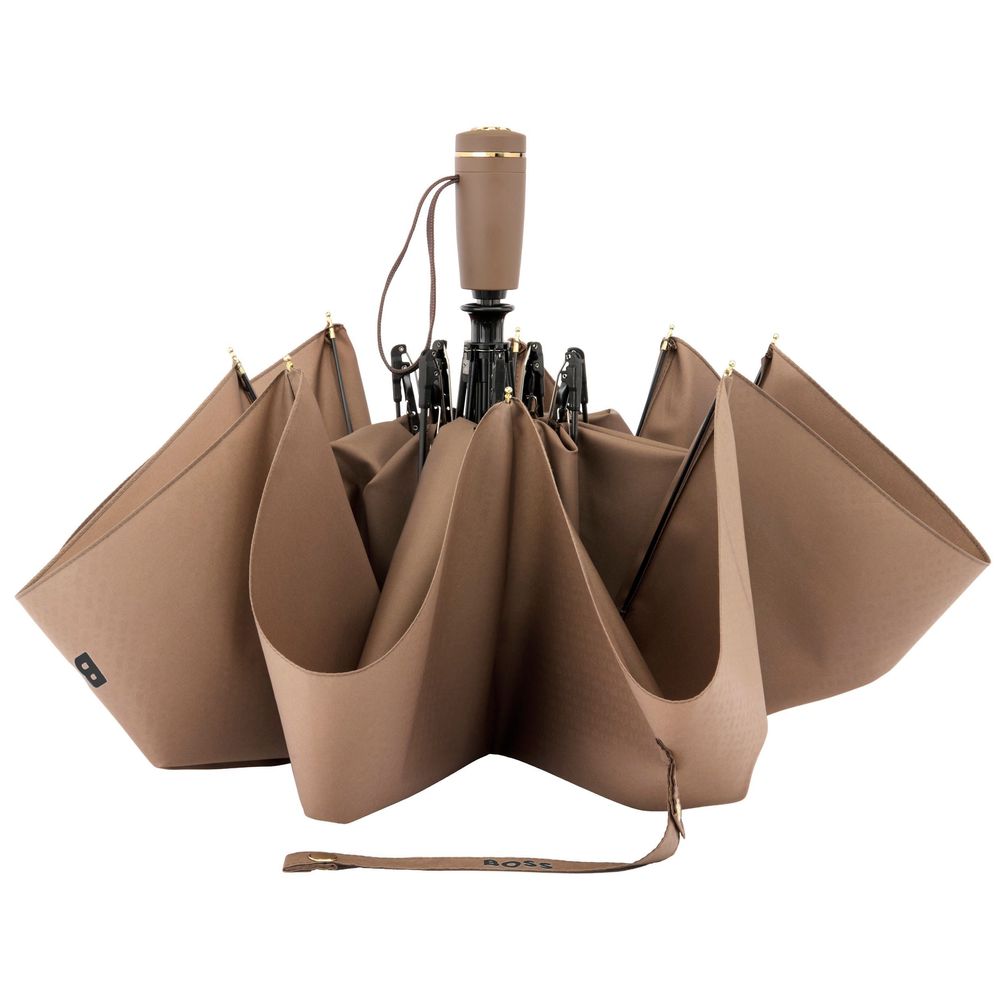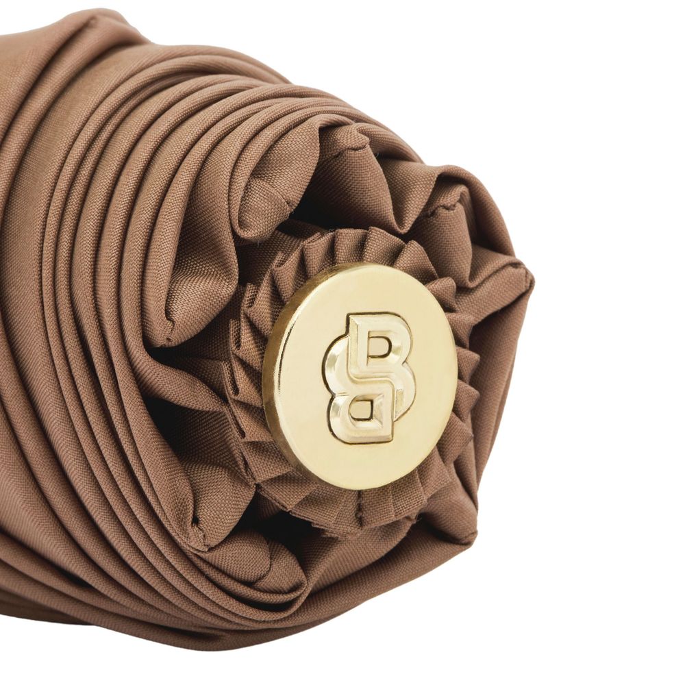 Карманный зонт Double B в цвете верблюжьей шерсти с золотыми металлическими акцентами украшен логотипом BOSS Double B с трехмерным исполнением, дополненным металлическим покрытием на концах ручки. Зонт имеет мягкую, напоминающую резину текстуру ручки и однотонный купол с монограммой, что придает ему изысканный вид. Благодаря легкой, эргономичной конструкции и двойной автоматической системе открытия и закрытия, этот зонт сочетает в себе удобство и стиль. Высококачественный, водоотталкивающий купол и роскошный чехол на молнии с гравировкой BOSS делают его как функциональным, так и портативным.