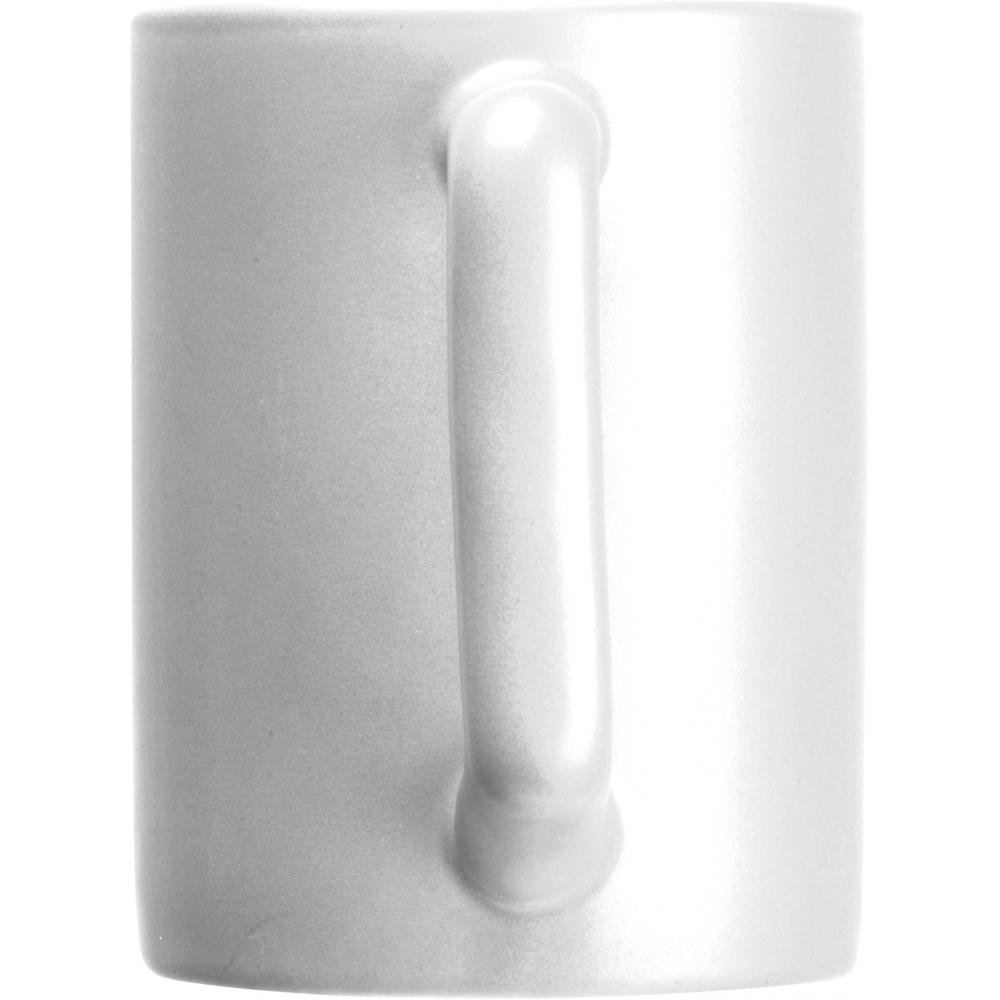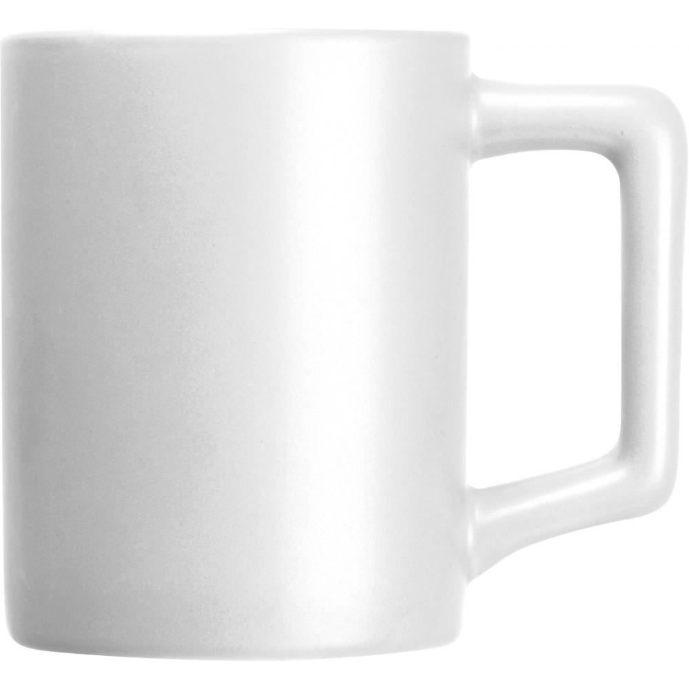 Керамическая кружка объемом 300 мл. Особый вид этой кружки создается благодаря прямоугольной ручке и матовому лаковому покрытию.