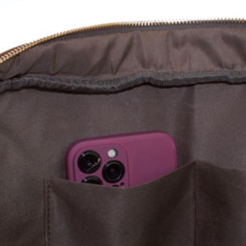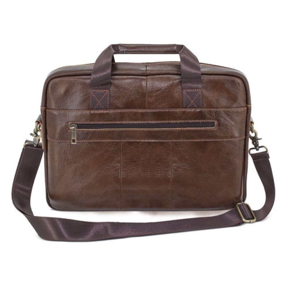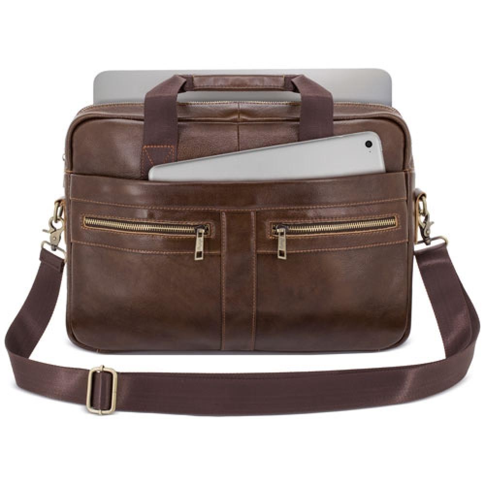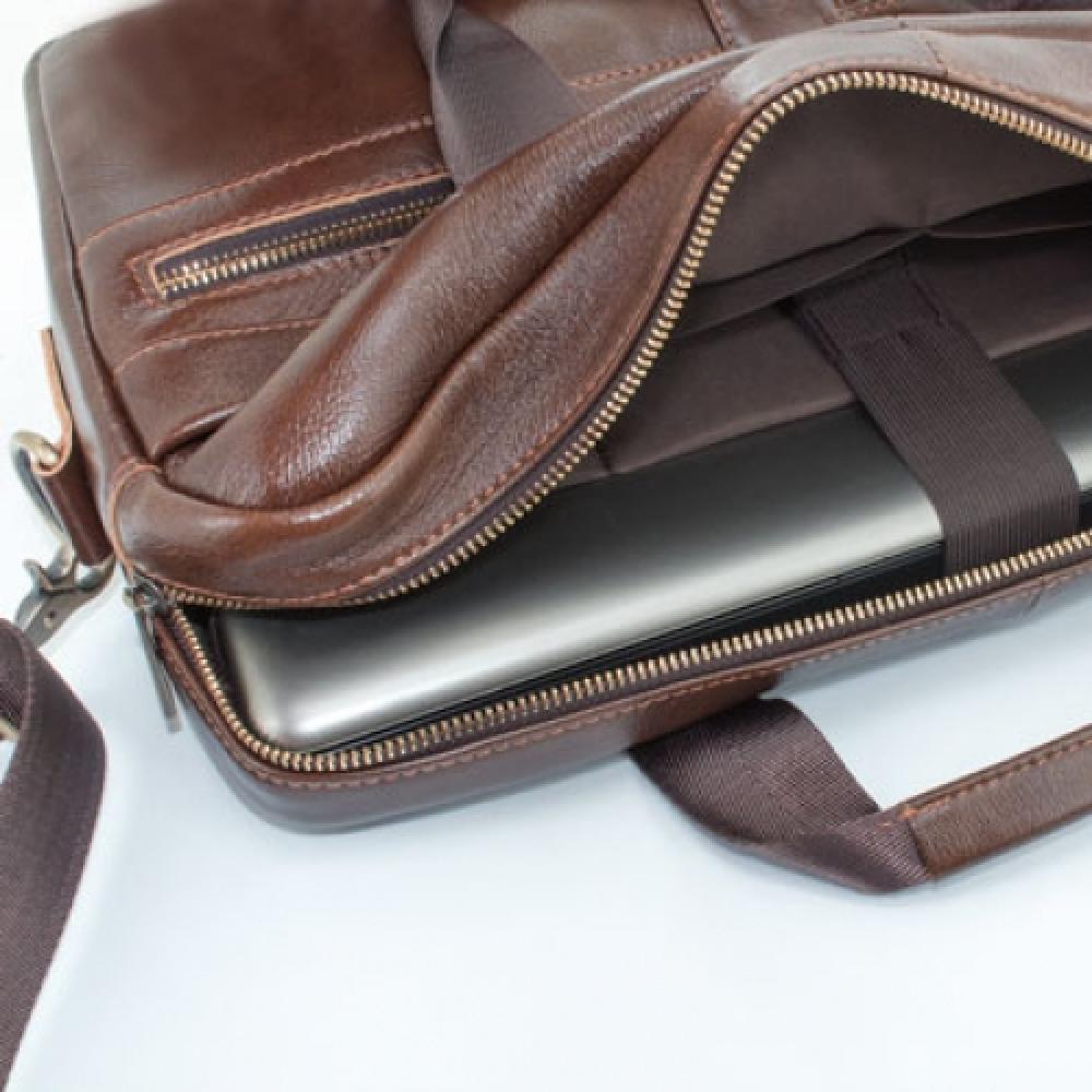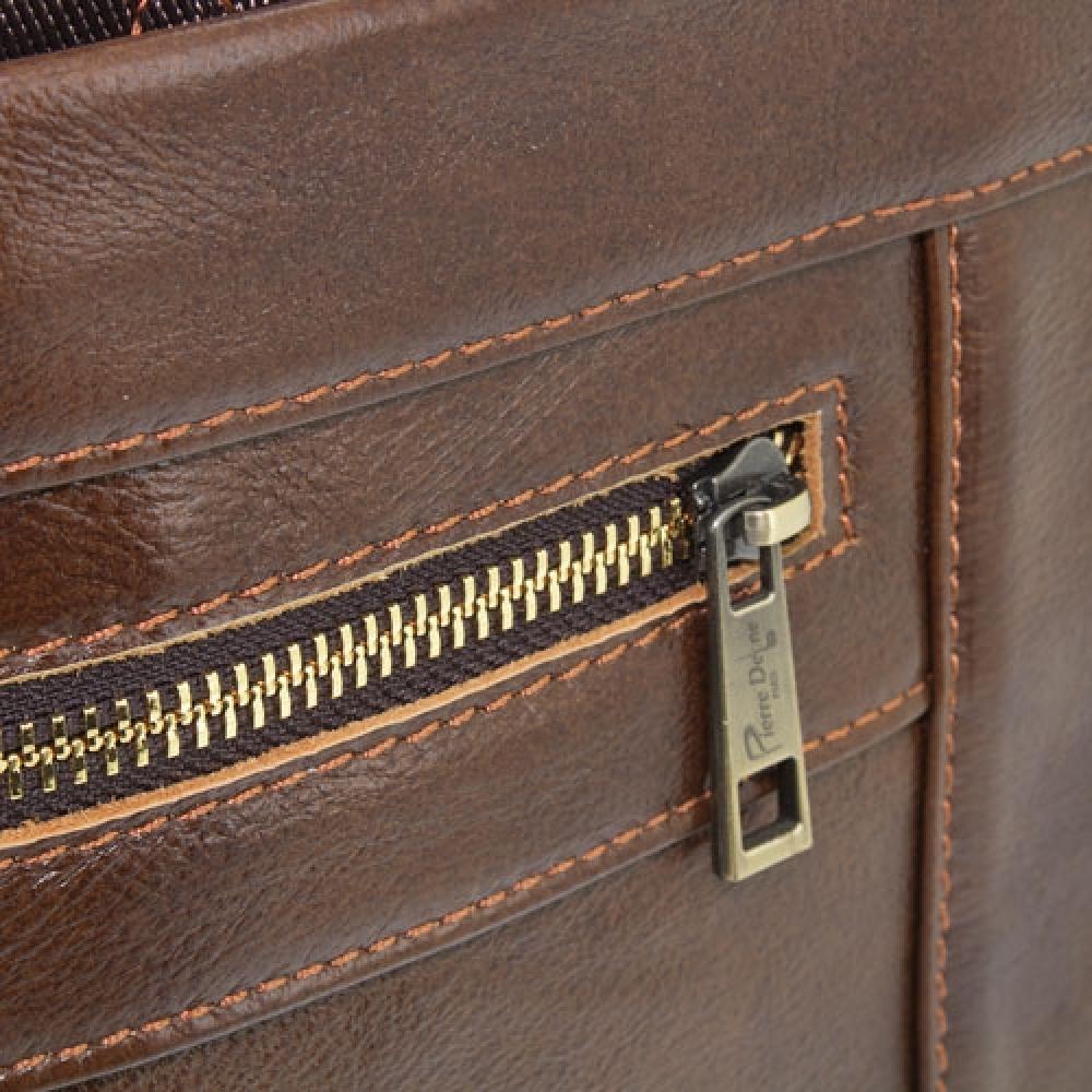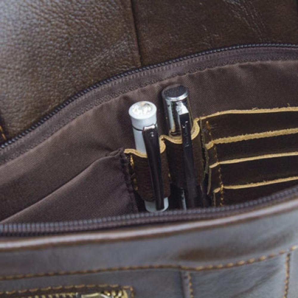 Сделан из натуральной кожи, с ручками и ремнем для ношения на плече. Внешние карманы на молнии и мягкая внутренняя отделка.