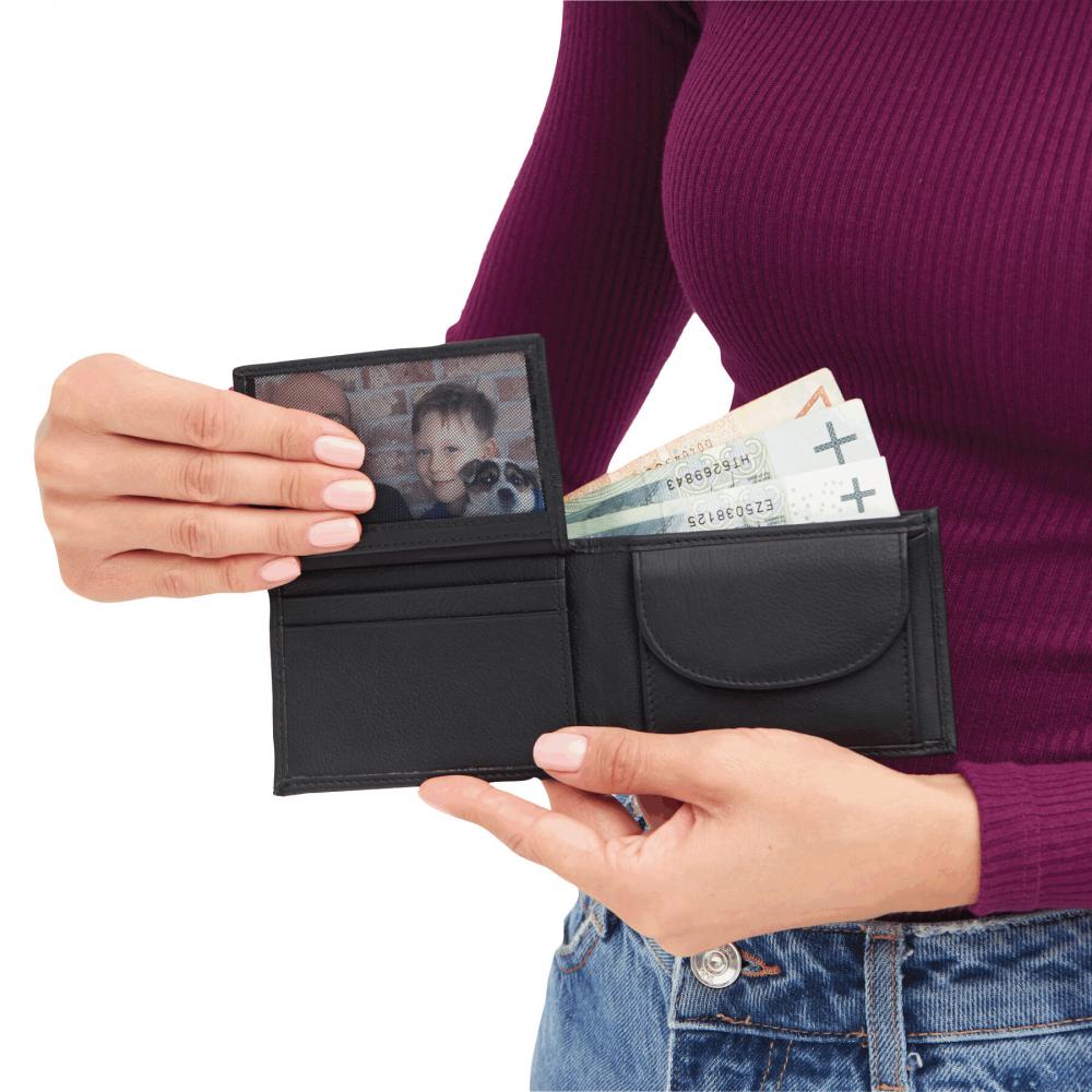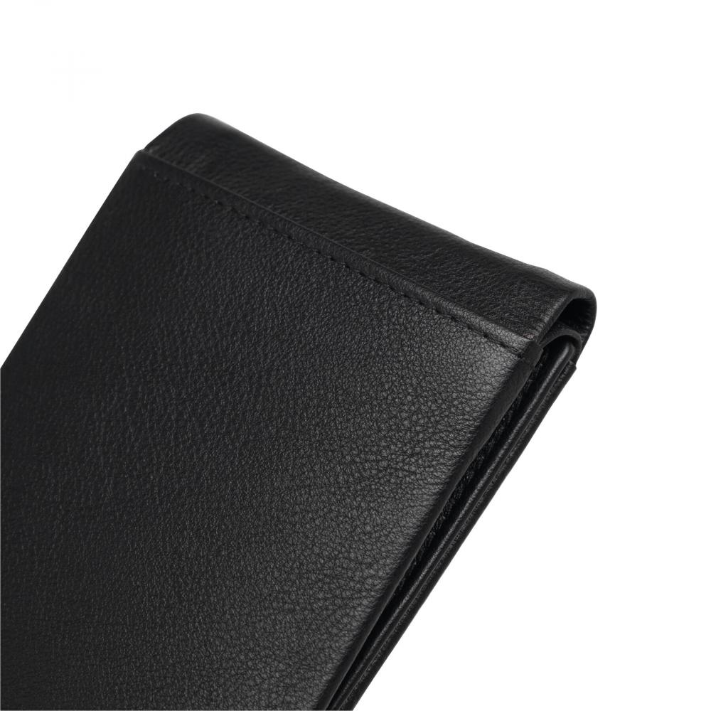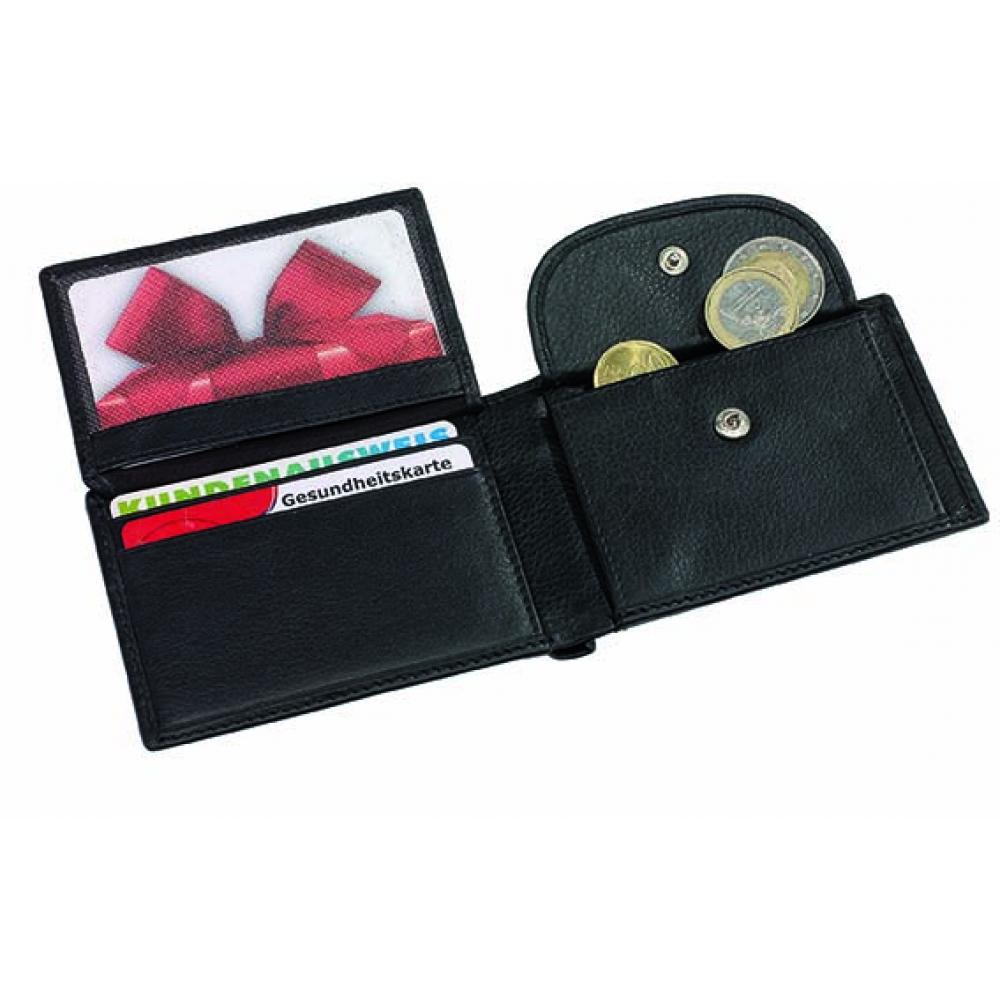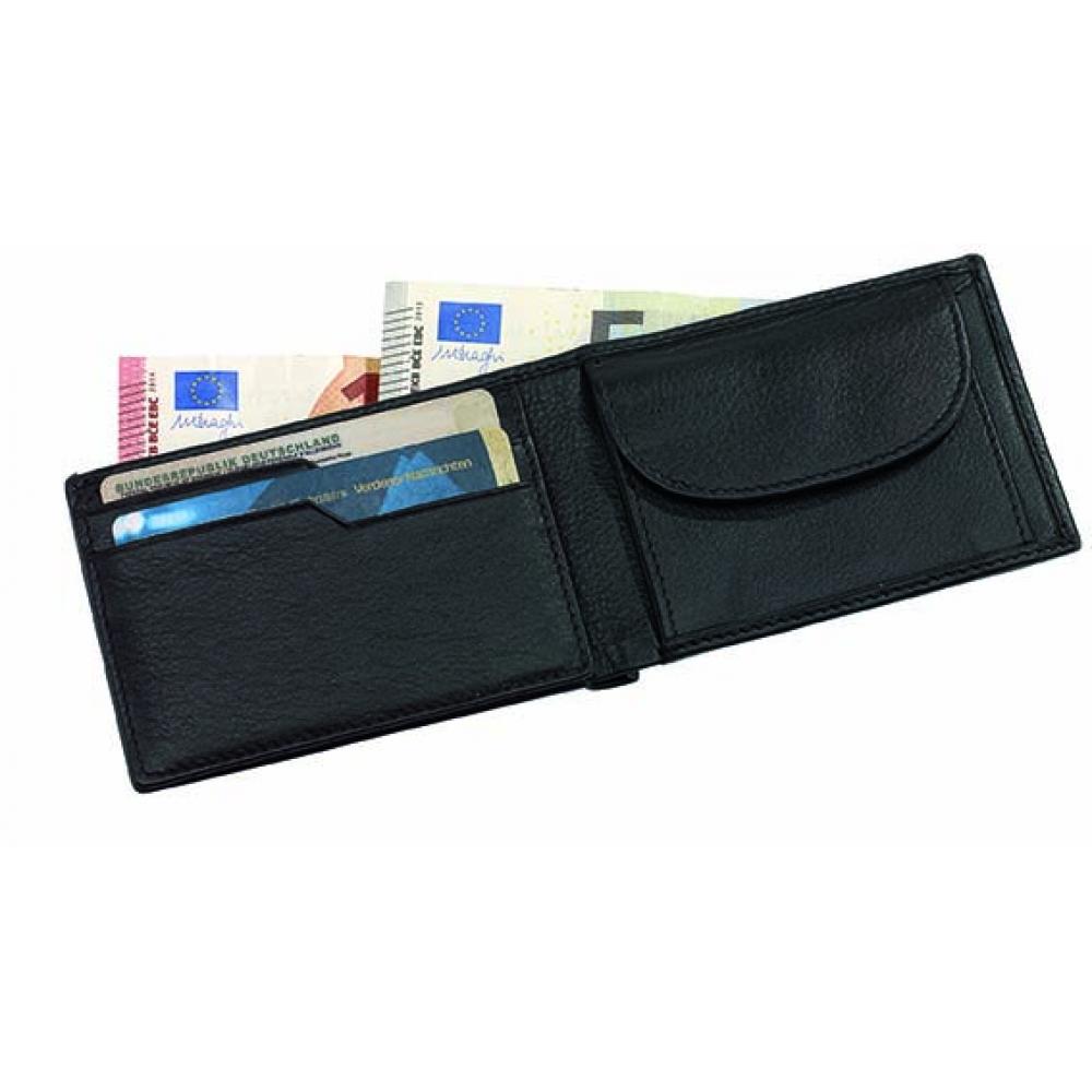 Кошелек из натуральной кожи HOLIDAY: 4 прорезиненных кармана для кредитных карт, 2 отделения для банкнот, 1 карман для монет на кнопке, 1 сетчатый карман для удостоверения личности или водительских прав, 1 прорезной карман для кредитных карт или карточек-ключей от отелей сзади