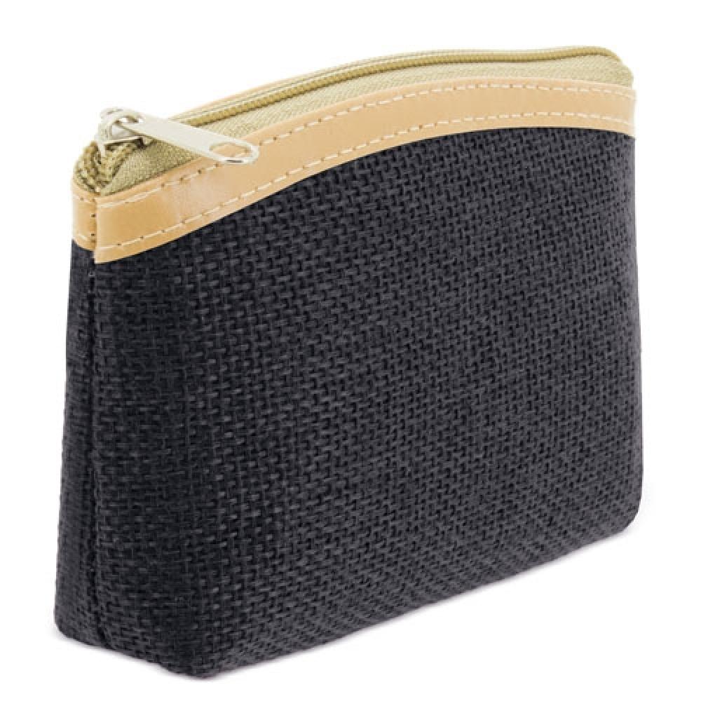 Кошелек из ткани, напоминающей джут, с аппликацией из искусственной кожи сверху. Доступен в четырех цветах: красный, темно-синий, черный и экрю.