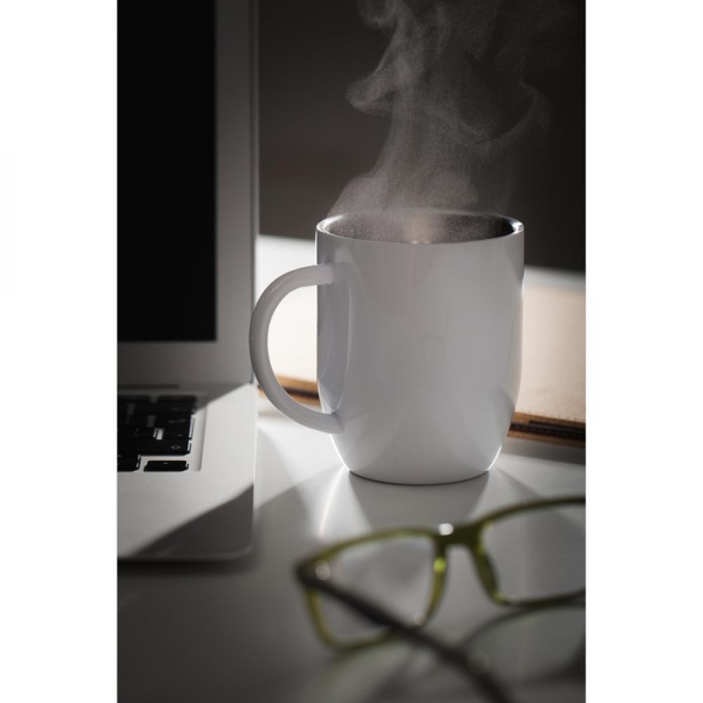 Кружка 380 мл с блестящим слоем лака. Две стены из нержавеющей стали. Внутренняя стенка из улучшенной нержавеющей стали 18/8. Форма похожа на классические керамические кружки.