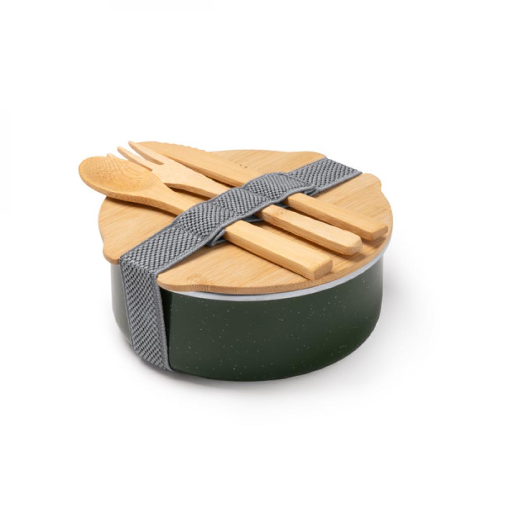 Ланч-бокс из металла с керамическим покрытием, с бамбуковой крышкой и эластичным ремешком для затягивания. В комплекте идет набор столовых приборов из бамбука. Вместимость: 750 мл. Представлено в экологически дизайнерской коробке.