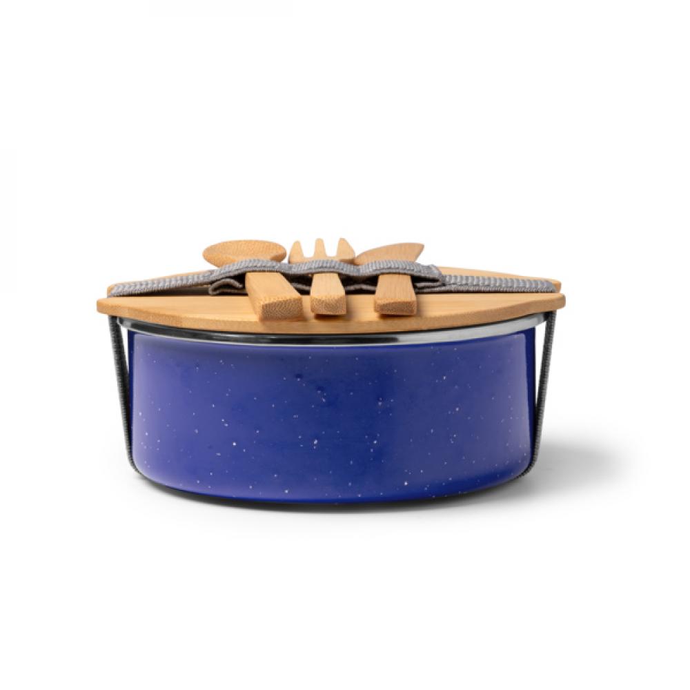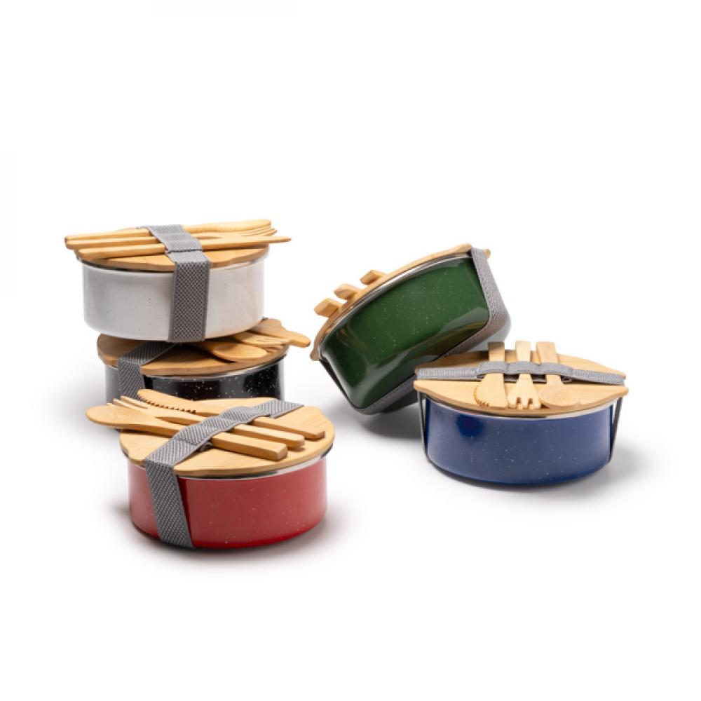 Ланч-бокс из металла с керамическим покрытием, с бамбуковой крышкой и эластичным ремешком для затяжки. В комплекте идет набор столовых приборов из бамбука. Вместимость: 750 мл. Поставляется в экологически дизайнерской упаковке.