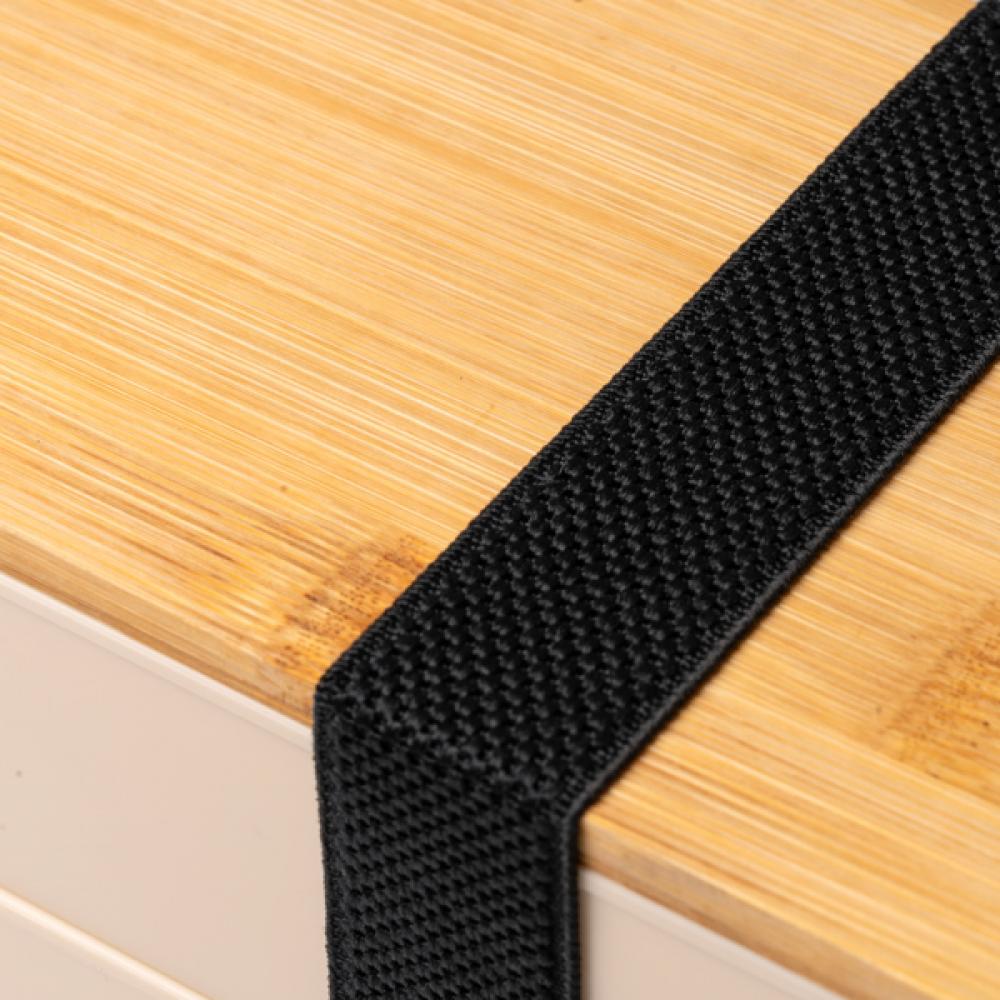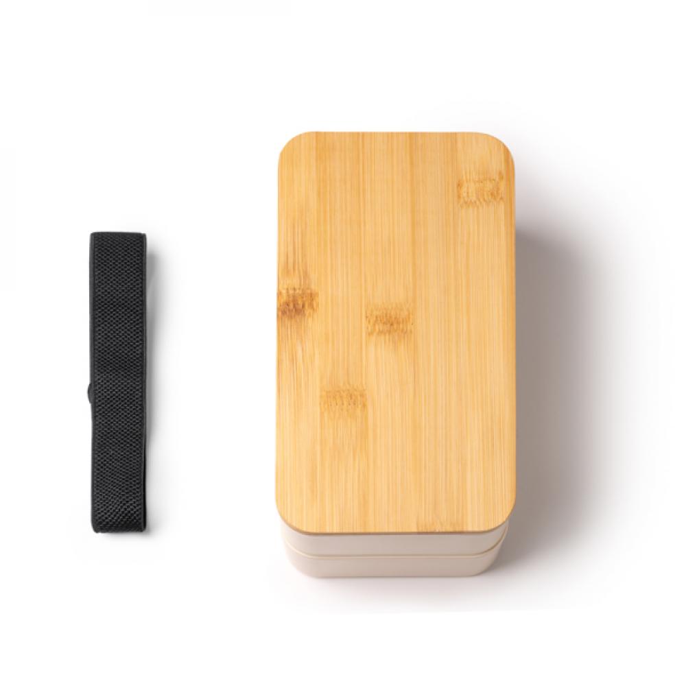 Ланч-бокс с двумя отделениями и крышкой из бамбука. В комплекте есть набор столовых приборов, съемный перегородчик и ремешок для фиксации. Вместимость - 800 мл.