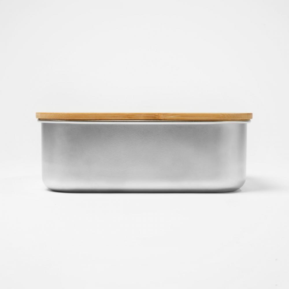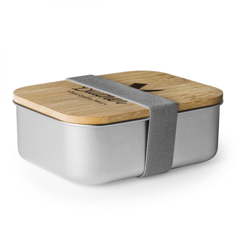 Ланч-бокс из нержавеющей стали 304 с бамбуковой крышкой и полиэстеровым безопасным ремешком. Вместимость 800 мл. Идеально подходит для персонализации и продвижения вашей компании.