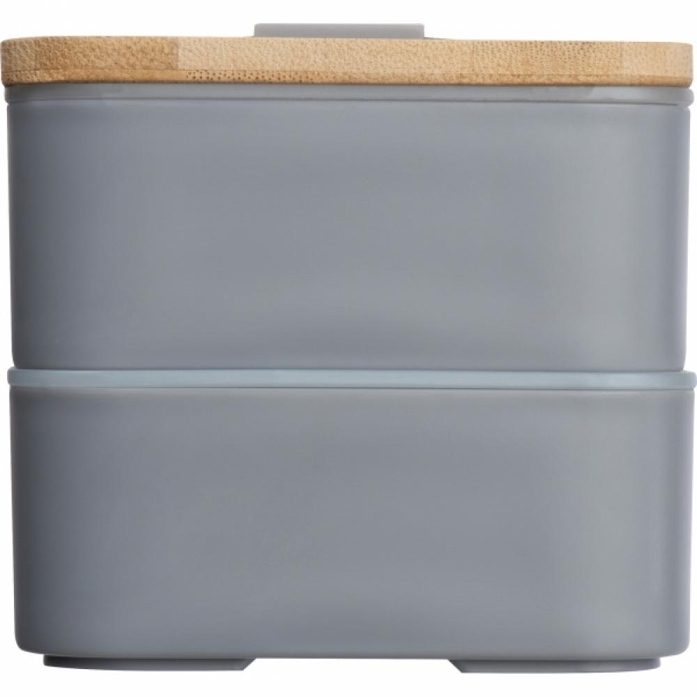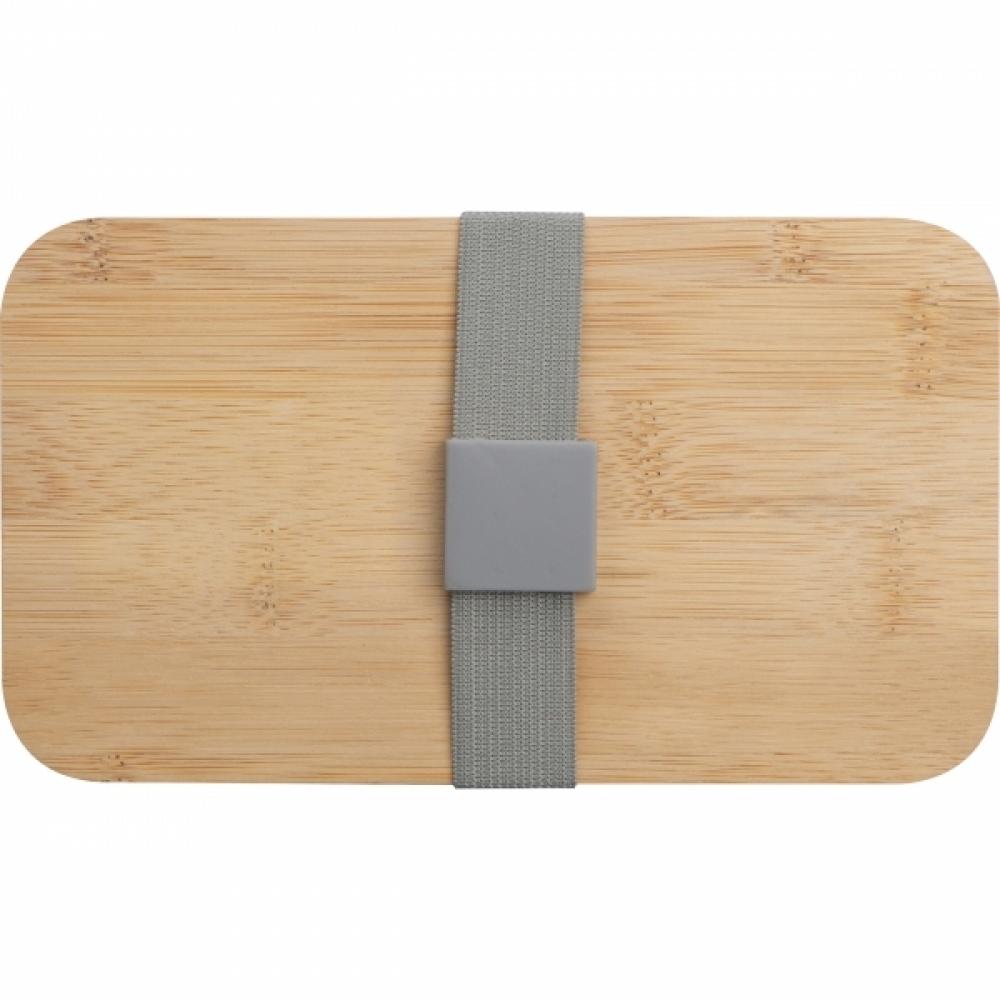 Двухуровневый ланчбокс с двумя отдельными отделениями (оба с собственной крышкой), бамбуковой крышкой и перегородкой (для разделения разных частей еды в одном отделении). Бамбуковую крышку можно использовать как разделочную доску или тарелку для пикника. В набор также входят нож, вилка и широкая резинка, соединяющая все элементы коробки для завтрака.