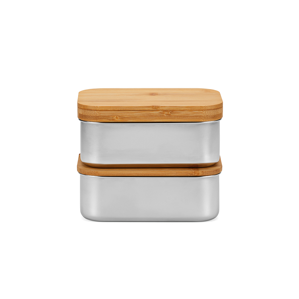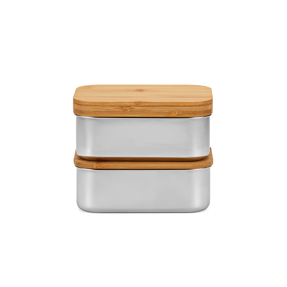 Наш набор ланч-боксов объемом 1480 мл (980 мл чистого объема) представляет собой удобный аксессуар с двумя отделениями. Изготовлен из переработанной нержавеющей стали с крышкой из бамбука, в которой есть специальные отделения для вилки, ножа и ложки. Эластичный ремешок надежно фиксирует крышку и обе части вместе, что делает его идеальным для путешествий.