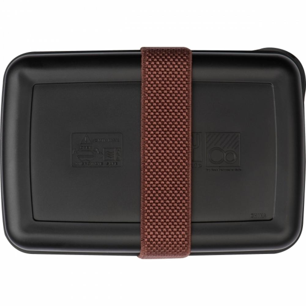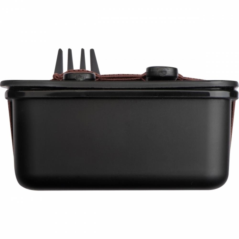 Ланчбокс из материалов, не содержащих бисфенола А, в комплекте с ножом и вилкой, закрепленными на резинке, скрепляющей коробку.