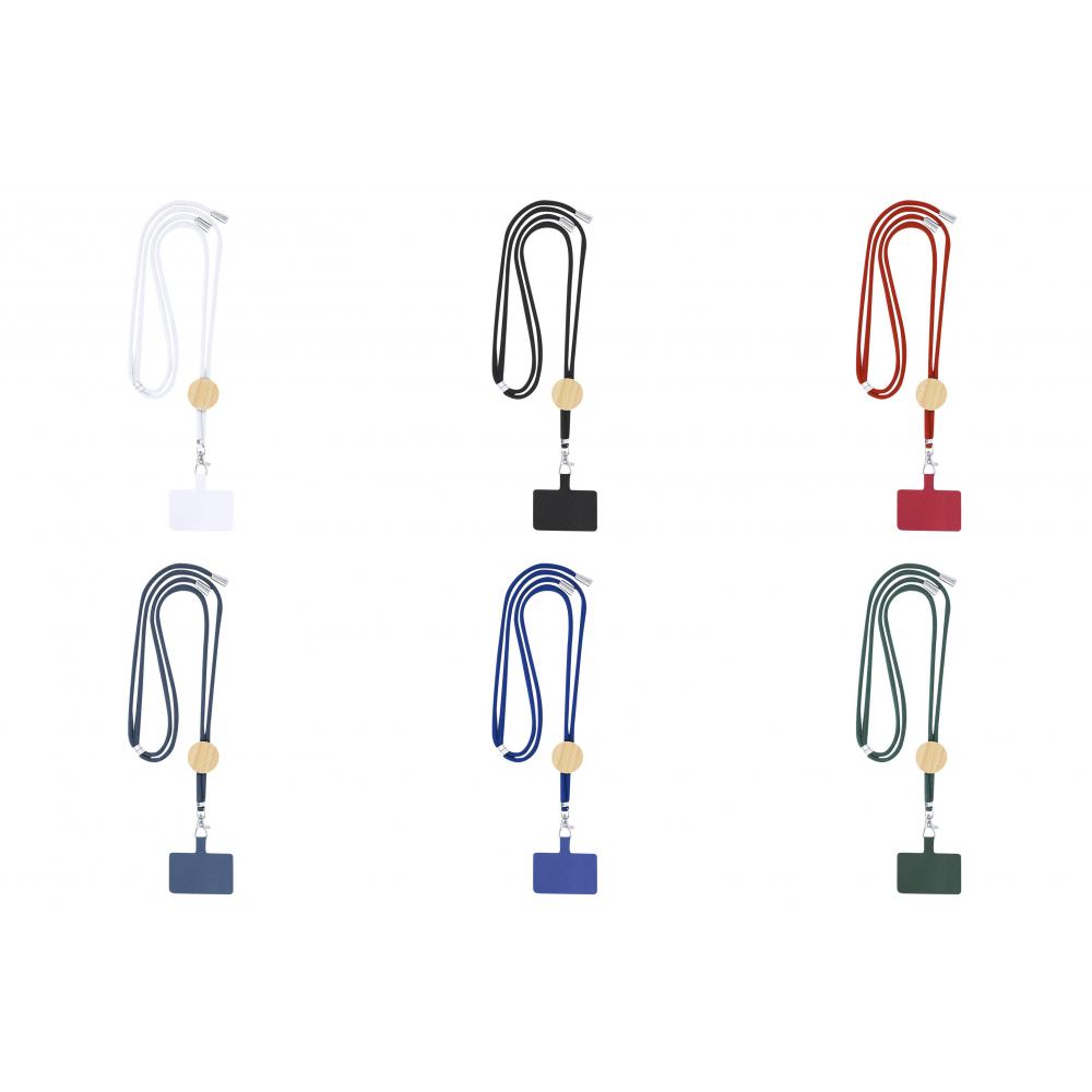 Ремешок с аксессуаром для смартфона. Изготовлен из прочного хлопка с вставкой из бамбука. В комплект входит аксессуар для транспортировки, который крепится между чехлом и смартфоном, а также металлический поворотный карабин. Шейные приспособления с хромированными деталями на концах шнура.