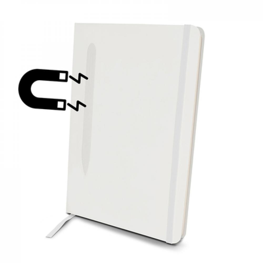 Блокнот А5 (80 листов в линейку), твердая полиуретановая обложка со встроенным магнитом для крепления шариковой ручки (не входит в комплект), маркер-лента и резинка для закрытия.