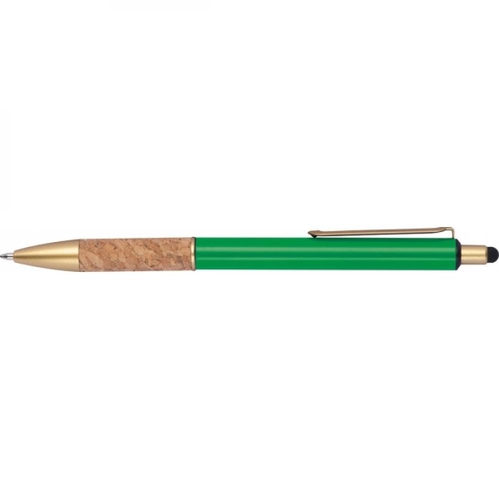 Металлическая ручка с золотыми деталями и пробковым захватом. Ручка пишет синим цветом.