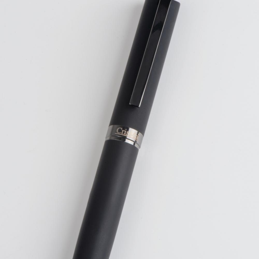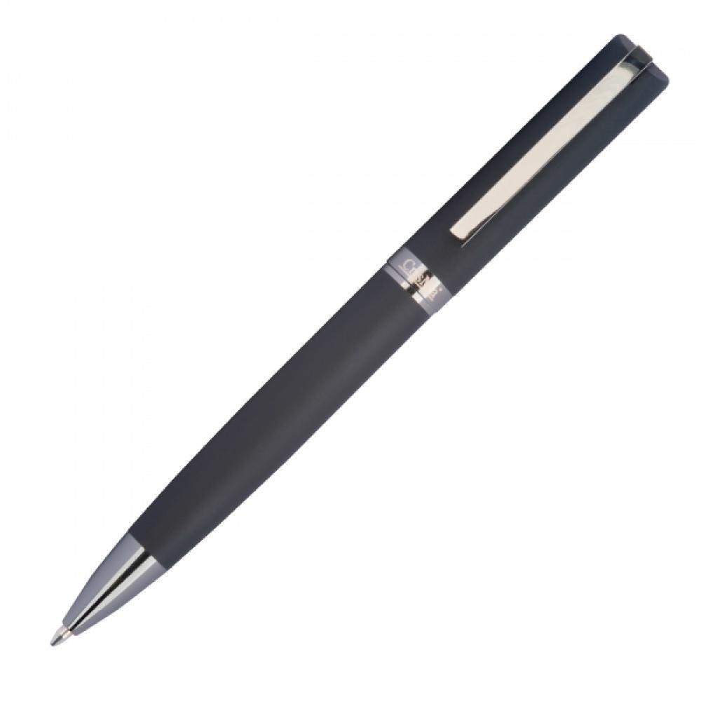 Металлическая ручка с поворотным механизмом и резиновым покрытием в классическом дизайне, с большим запасом чернил, пишет синим цветом. Ручка поставляется в черном футляре.