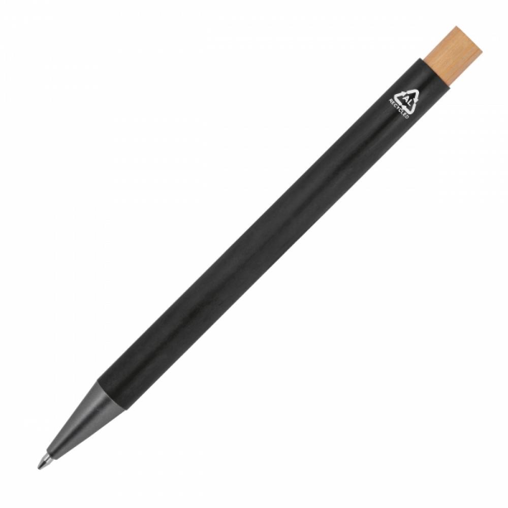 Ручка из переработанного алюминия с бамбуковым толкателем, металлической клипсой и большим запасом чернил синего цвета. Ваша реклама гравируется справа от клипсы.