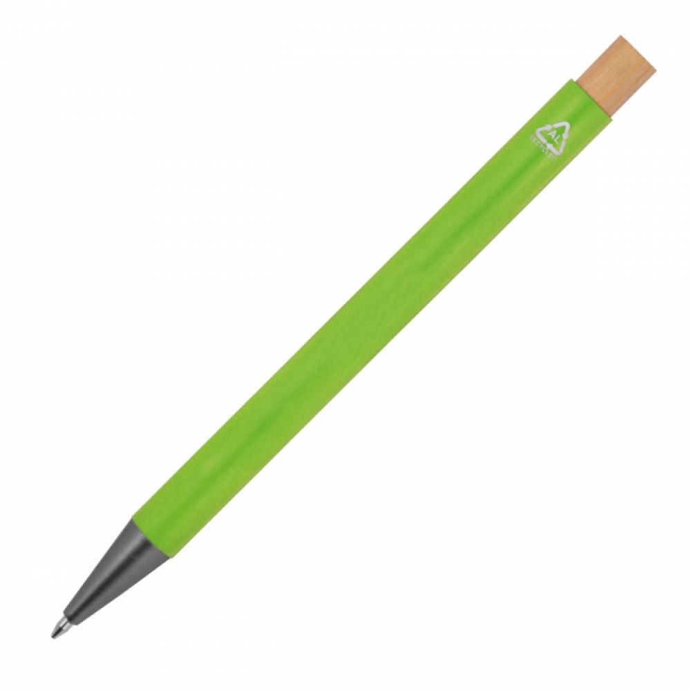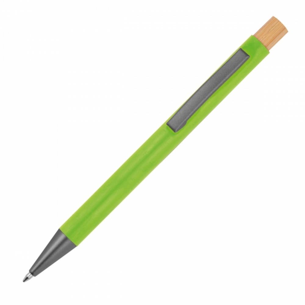 Ручка из переработанного алюминия с бамбуковым толкателем, металлической клипсой и большим стержнем с синей пастой.