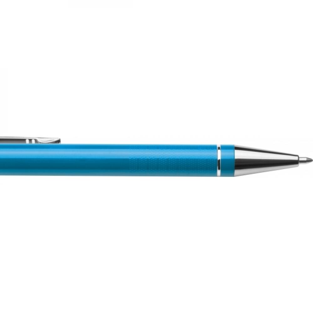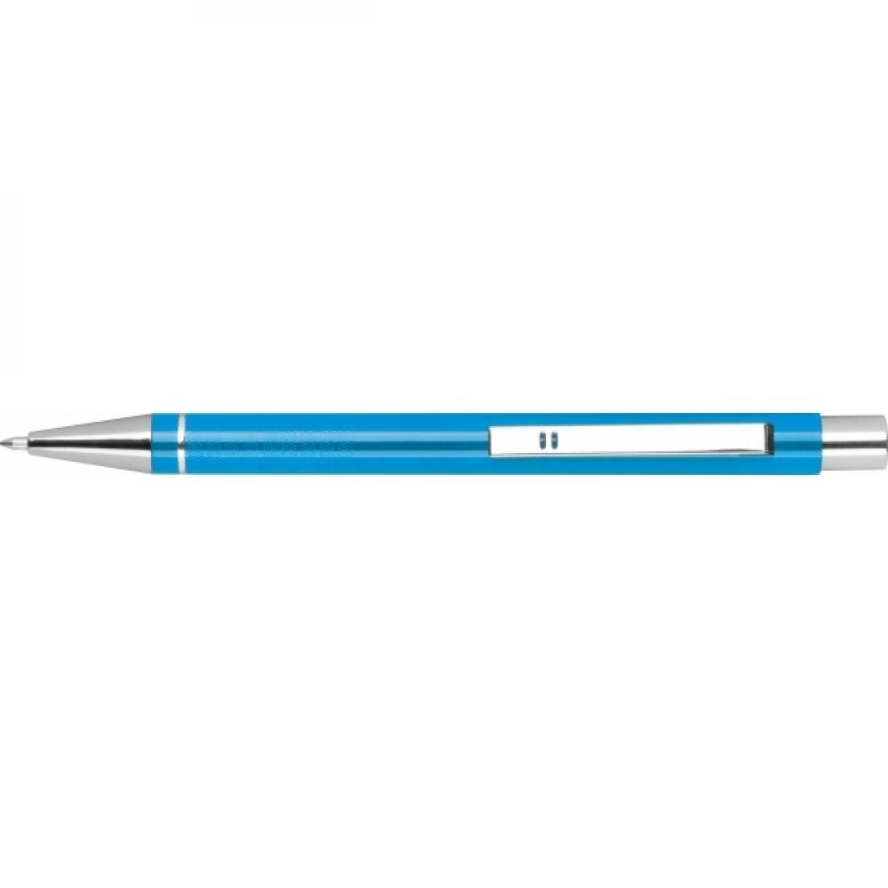 Шариковая ручка из алюминия с синей полугелевой заправкой (1 мм кончик) и ребристой зоной для удержания.