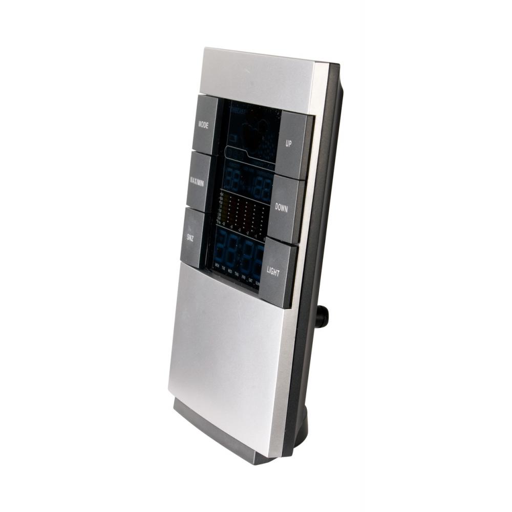 Цифровые часы и метеостанция с цветным дисплеем. Функции: будильник, термометр, гигрометр и 12-часовая память трендов температуры. Работает от 2 батареек AAA, поставляемых без батареек.