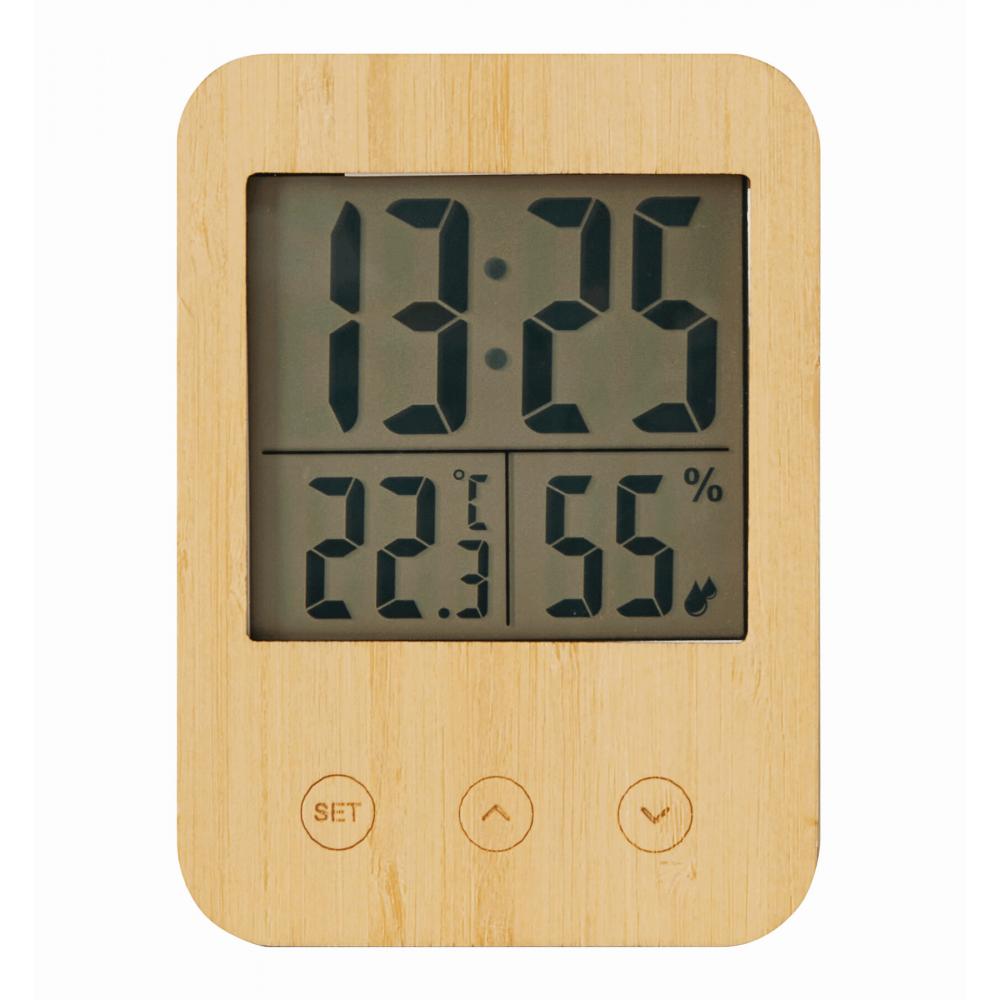 Метеостанция Weather station MIX: с бамбуковой передней панелью, функцией будильника, отображением даты и времени, гигрометром и термометром (в °C и °F), откидной подставкой и отверстием для настенного крепления на задней стороне