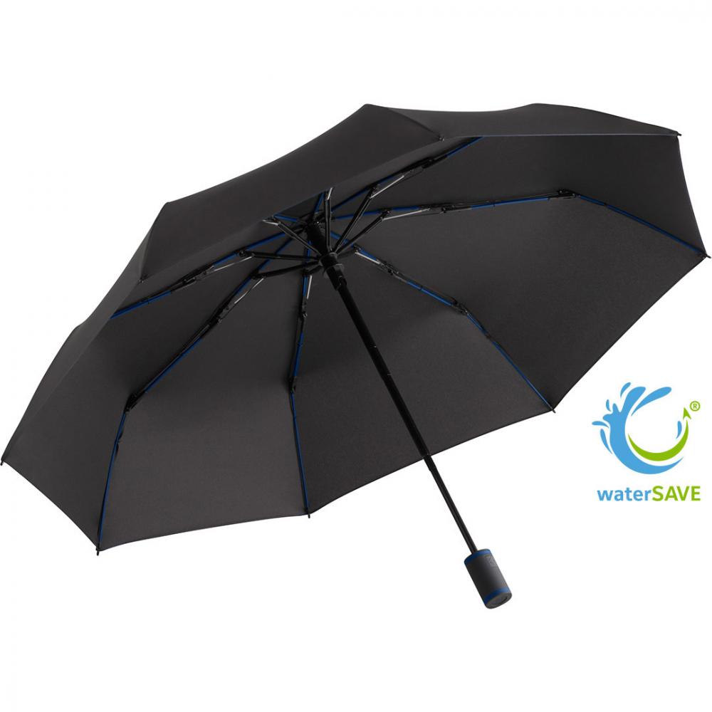 Удобная автоматическая функция открытия/закрытия для быстрого использования, высококачественная ветрозащитная система для максимальной гибкости каркаса в штормовых условиях, гибкие спицы из стекловолокна, материал полиэстер понже из переработанных пластиков, экологически чистый благодаря оригинальному материалу покрытия waterSAVE из переработанных пластиков, с этикеткой waterSAVE® на застежке (в новых поставках), привлекательный дизайн благодаря цветным спицам, кольцам на ручке и швам, удобная ручка Soft-Feel с интегрированной кнопкой и возможностью нанесения рекламной надписи, удобный чехол с цветными швами и ремнями для переноски. Также доступен в виде мини-зонта.