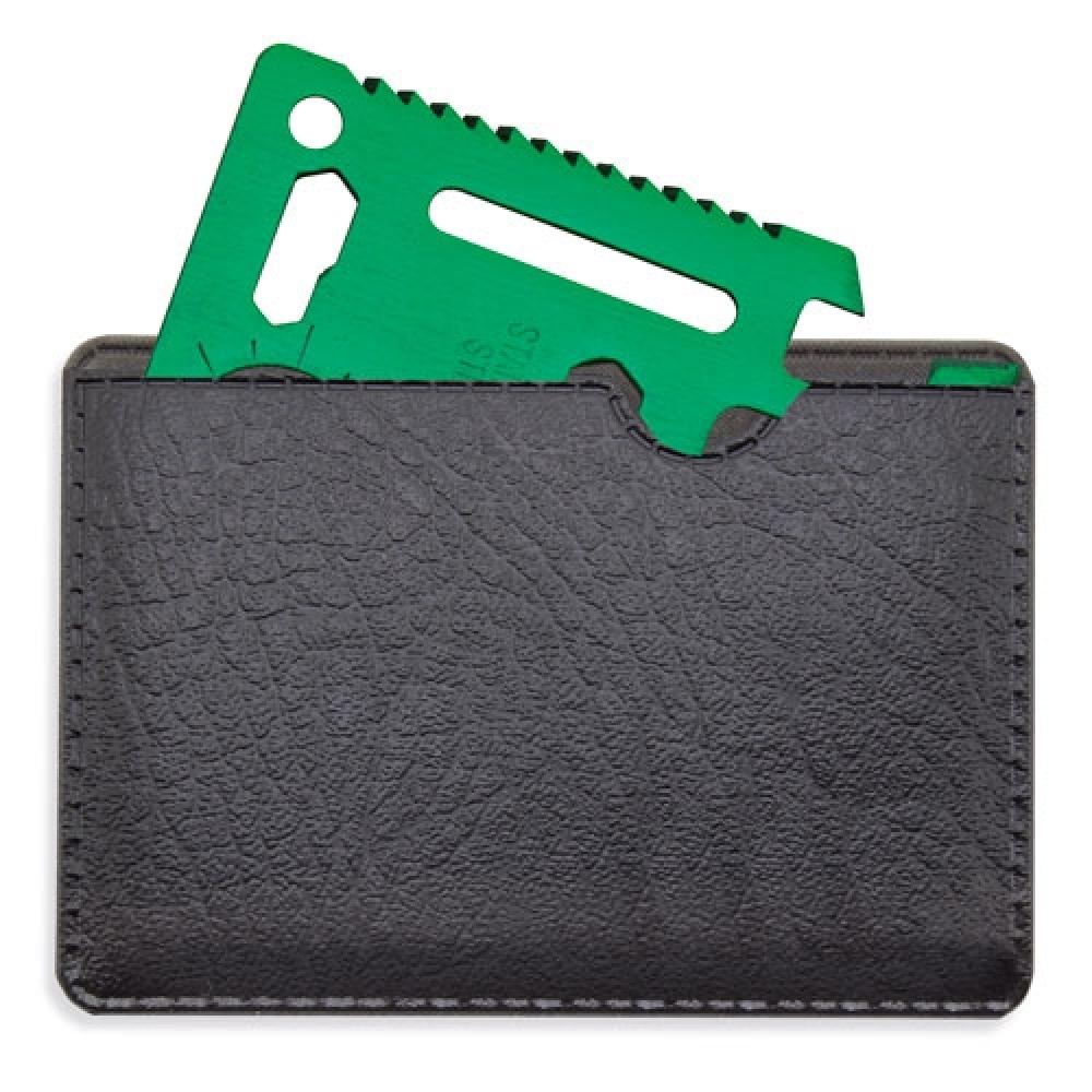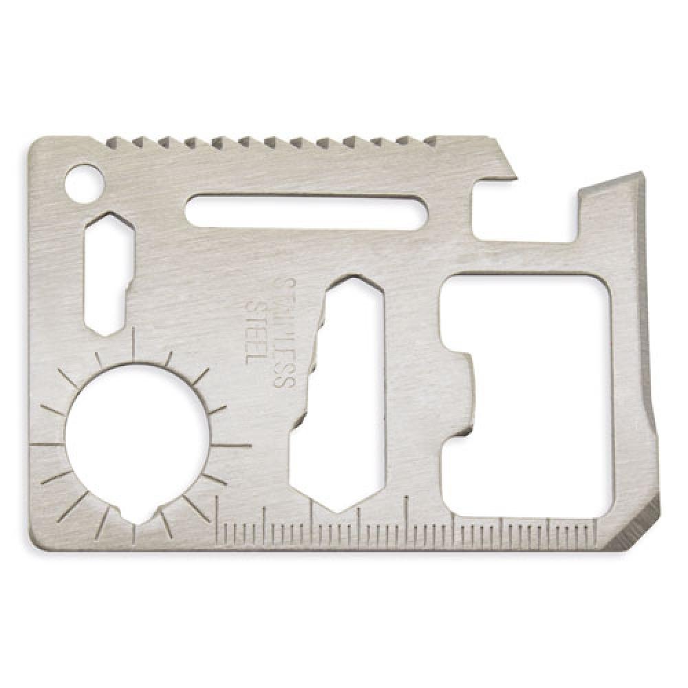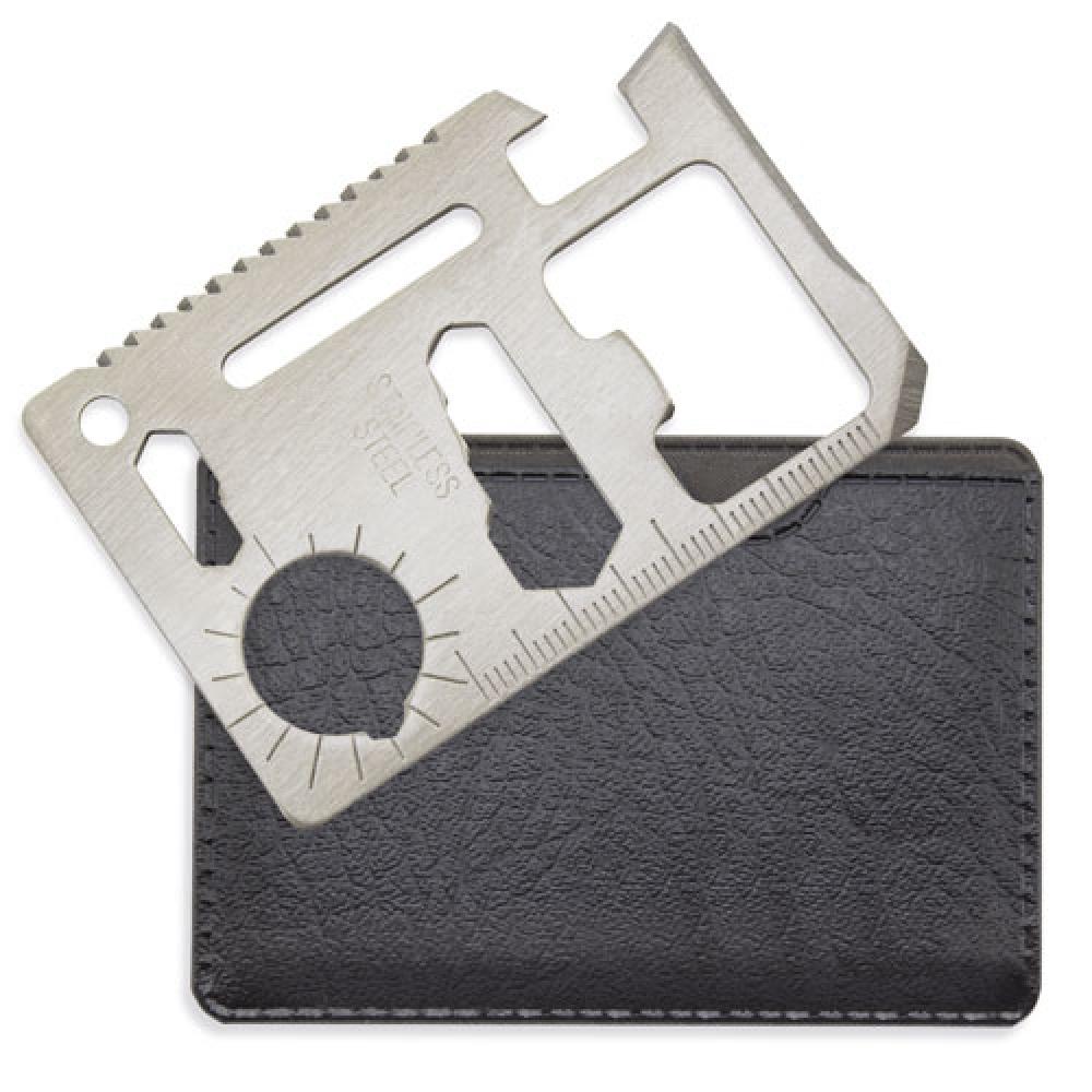С кожаным чехлом 11 ФУНКЦИЙ 1. Консервный нож 2. Лезвие ножа 3. Отвертка 4. Линейка 5. Открывалка для бутылок 6. Гаечный ключ на 4 позиции 7. Ключ для барашковых гаек 8. Пильное полотно 9. Водяной компас 10. Гаечный ключ на 2 позиции