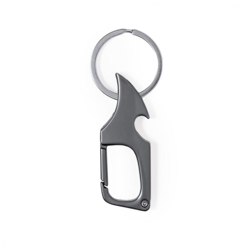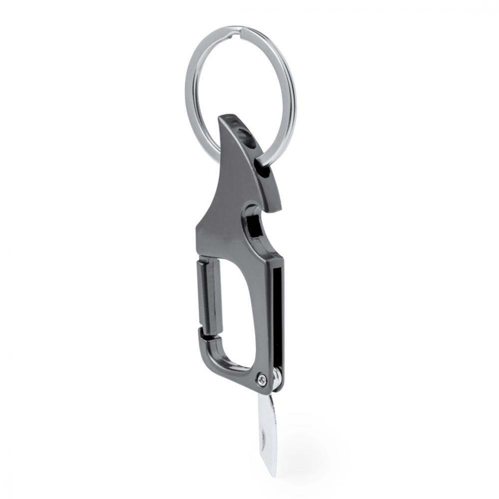 Полезный металлический открывалка с кольцом для ключей и карабином для быстрого крепления. С открывалкой для бутылок с одной стороны и небольшим ножом из нержавеющей стали с другой стороны, идеально подходит для открытия писем, посылок... В элегантном металлическом черном цвете и упакован в перерабатываемый бумажный пакет. Металл