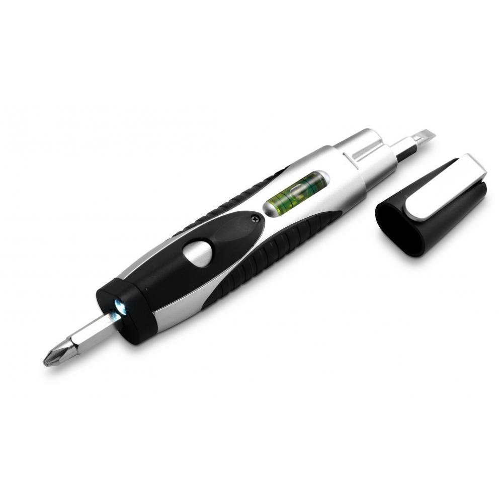 Многофункциональный инструмент: отвертка с 4 различными насадками, спиртовым уровнем и синим светодиодным фонариком