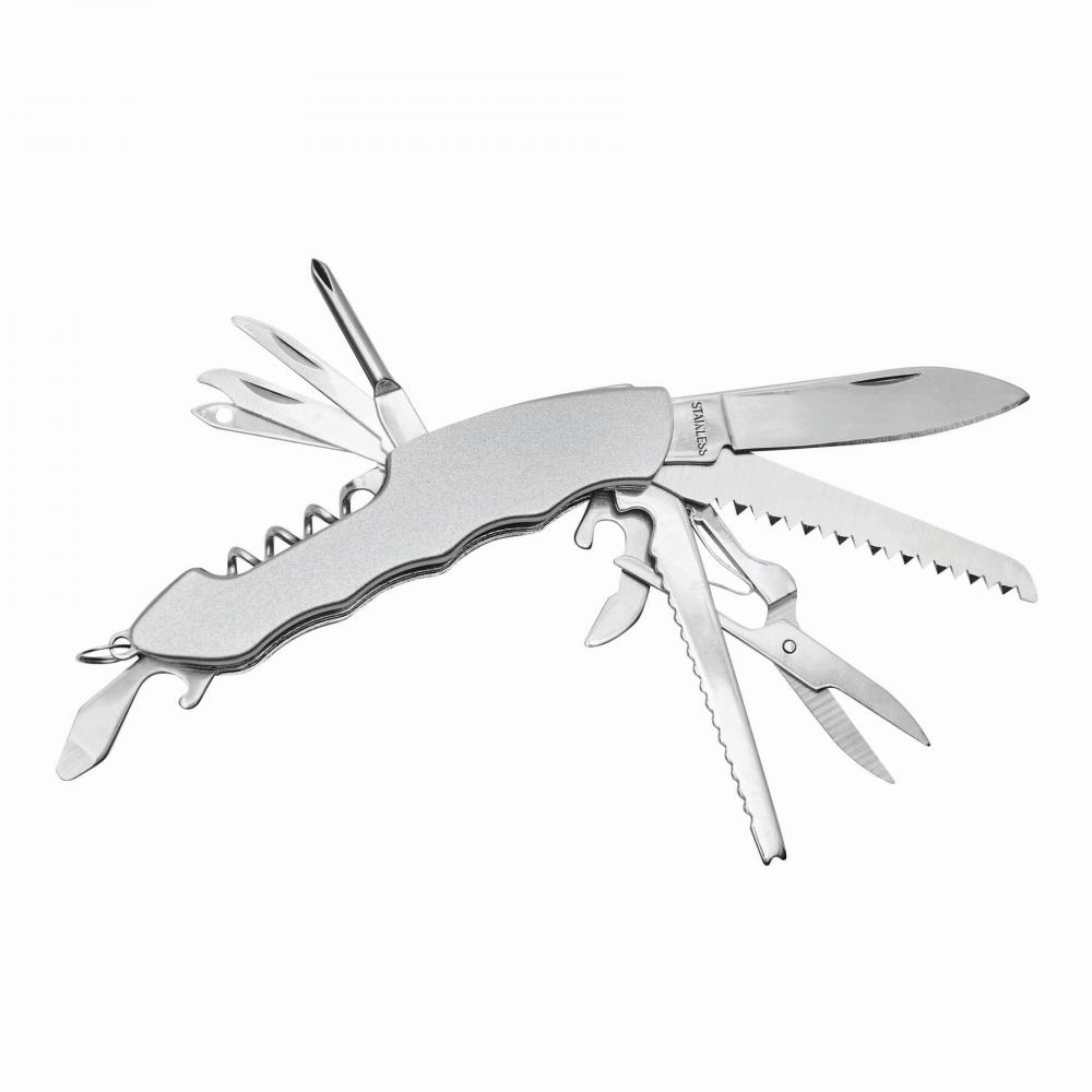 Карманный нож ВСЕ ВМЕСТЕ, состоящий из 11 предметов, с ножницами, ножом, 1 большой и 1 маленькой пилой, консервным ножом, открывалкой для бутылок, штопором, пилкой для ногтей, шилом, дыроколом и отверткой, упакованы в подарочную коробку