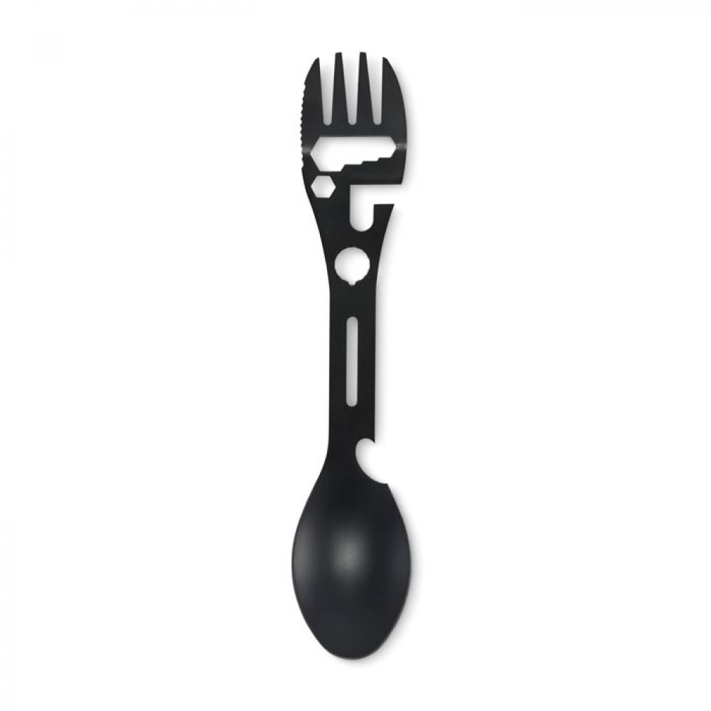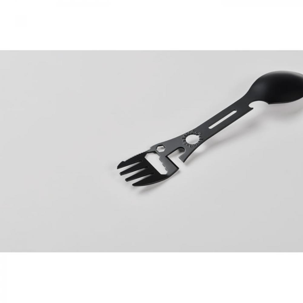 Многофункциональный столовый прибор из нержавеющей стали. Включает в себя ложку, вилку, разводной ключ, открывалку для бутылок, шестигранный ключ, нож с зазубренным лезвием, открывалку и позиционный ключ.