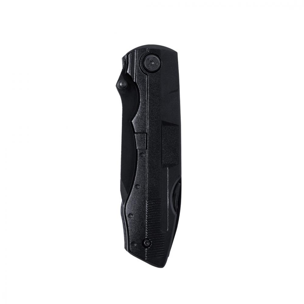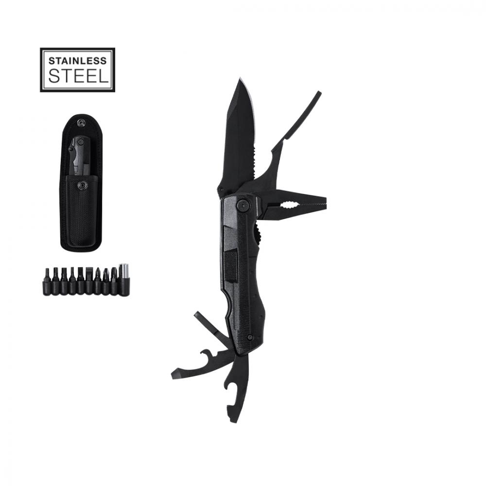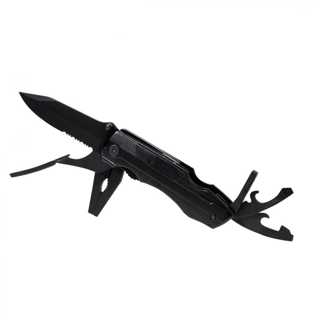 Универсальный нож с черным покрытием из нержавеющей стали и прочной алюминиевой рукояткой. Компактный складной дизайн. Включает 10 функций: - Отвертка с несколькими насадками - Гладкий и зубчатый нож - Открывалка для бутылок - Открывалка для консервных банок - Клещи с режущим проволочным ножом. Поставляется в практичном полиэстеровом чехле, соответствующем аксессуарам для пояса.