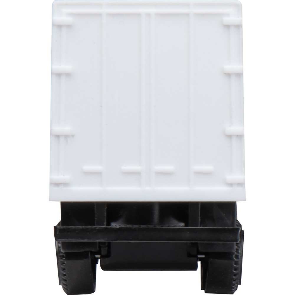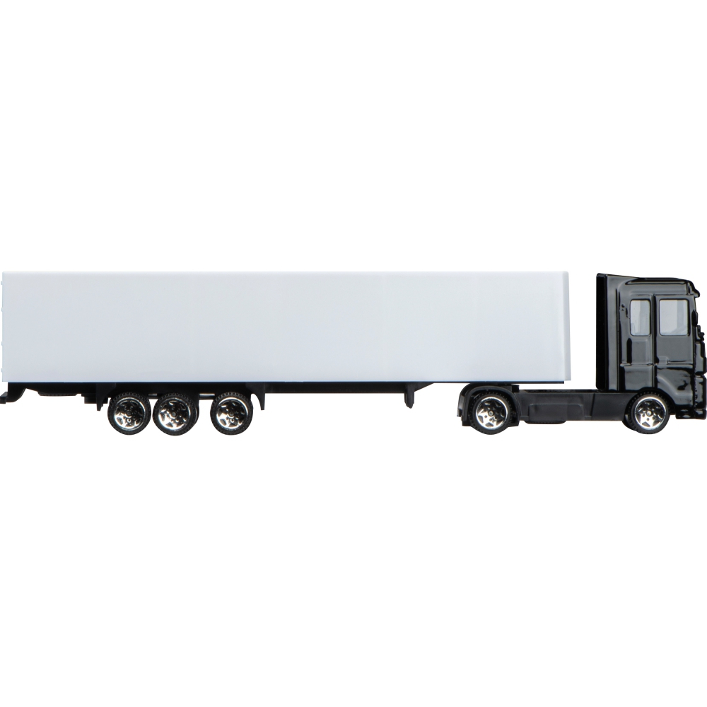 Миниатюрный грузовик с металлической кабиной водителя и пластиковым прицепом. Белая поверхность прицепа идеально подходит для полноцветной цифровой печати.