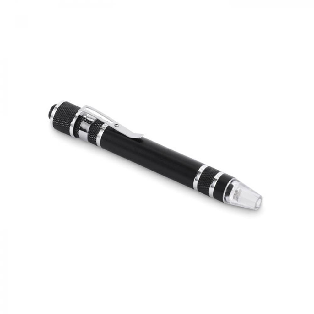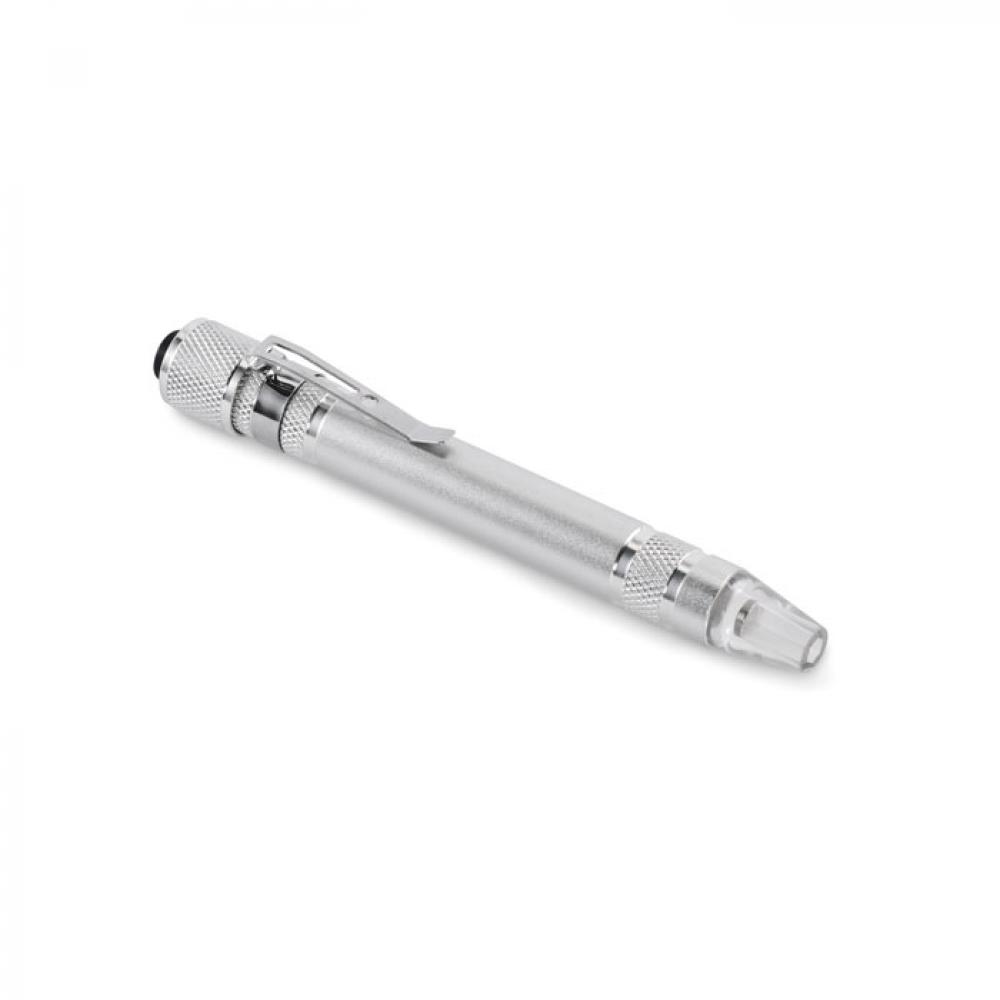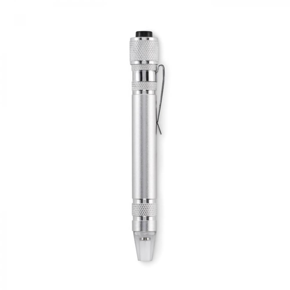 Мультиинструмент из переработанного алюминия в форме ручки с фонариком. Включает 3 шлицевые и 3 крестовые отвертки. В комплект входят 4 батарейки LR41.