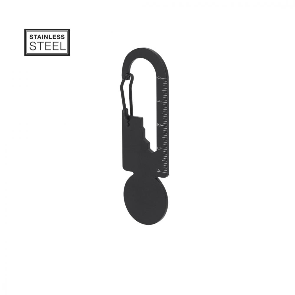 Мультитул из нержавеющей стали с матовым черным покрытием. Разработан для удовлетворения различных потребностей, включает в себя 8 функций: гаечный ключ различных размеров, линейка для измерений, открывалка для бутылок, монетка для тележки, и т. д. С карабином для закрытия.