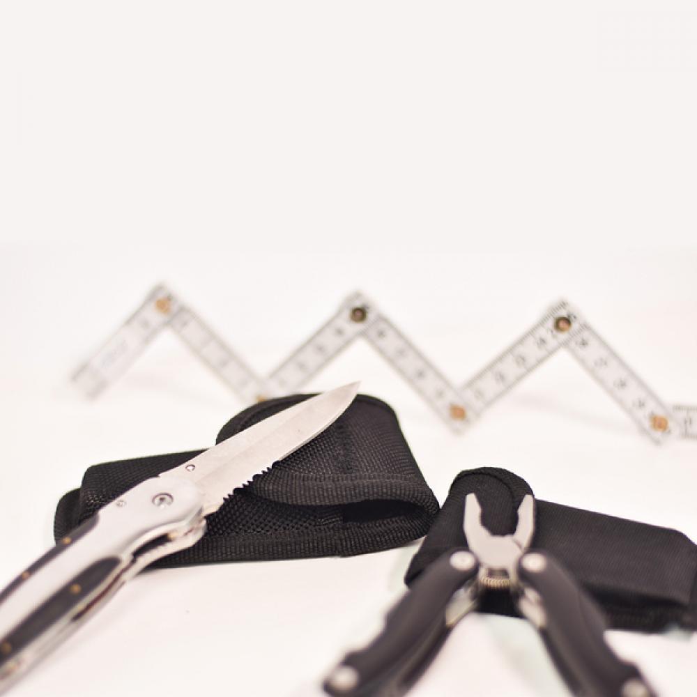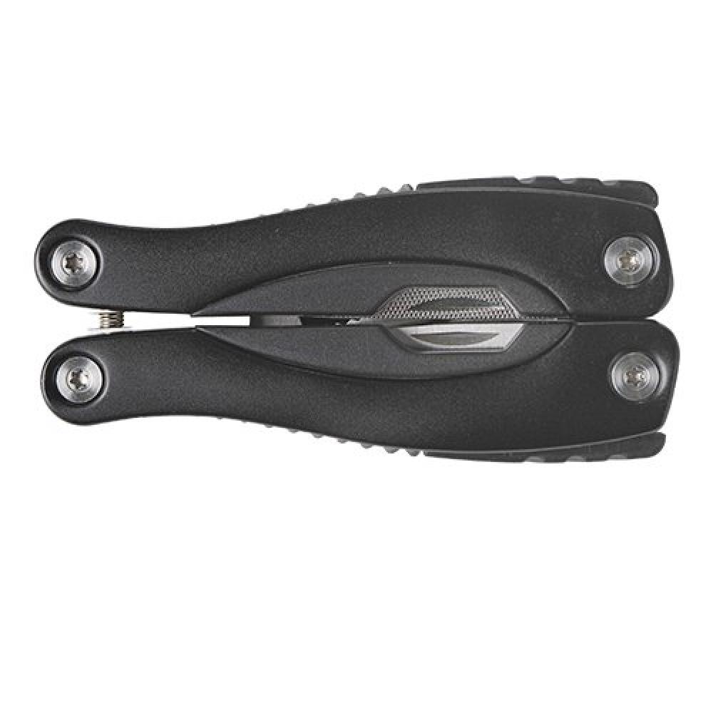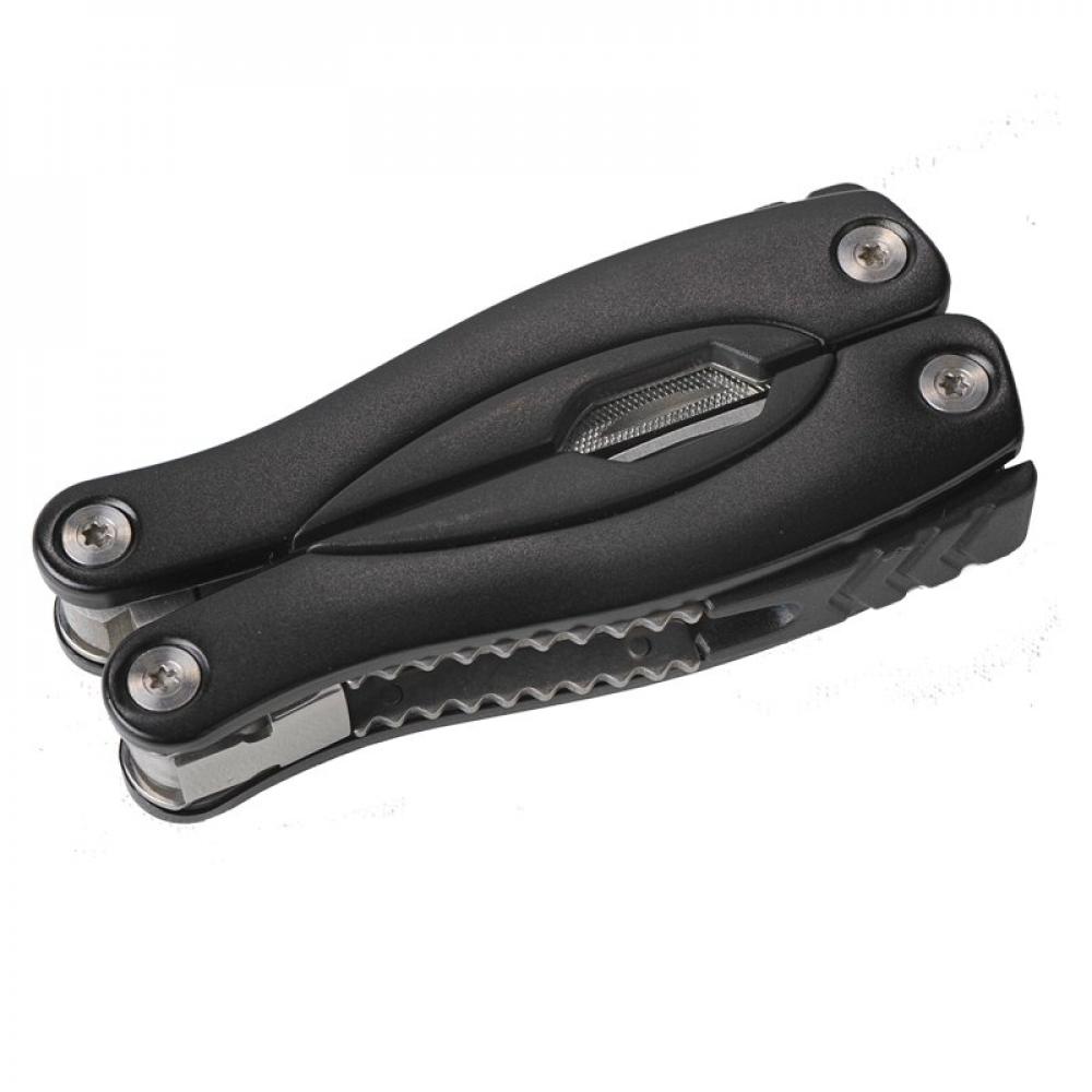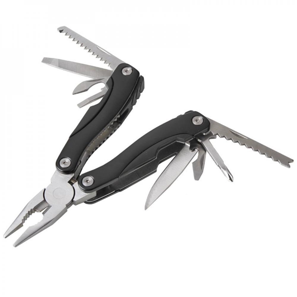 9-функциональный многофункциональный инструмент из нержавеющей стали в алюминиевом корпусе. В его состав входят: пила, плоские отвертки, консервный нож, напильник, универсальные плоскогубцы, скребок для рыбы, открывалка для бутылок, нож и Philips. Упакован в чехол из полиэстера.