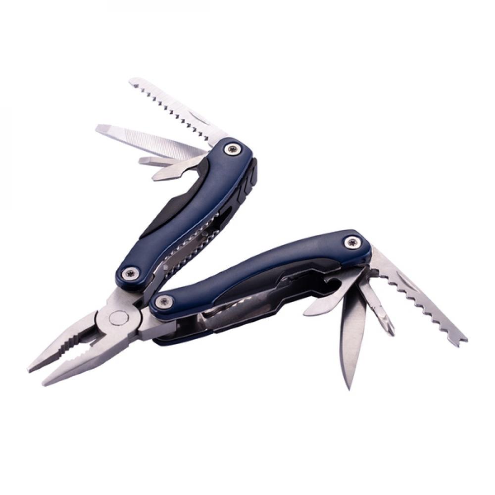 9-функциональный многофункциональный инструмент из нержавеющей стали в алюминиевом корпусе. В его состав входят: пила, плоские отвертки, консервный нож, напильник, универсальные плоскогубцы, скребок для рыбы, открывалка для бутылок, нож и Philips. Упакован в чехол из полиэстера.