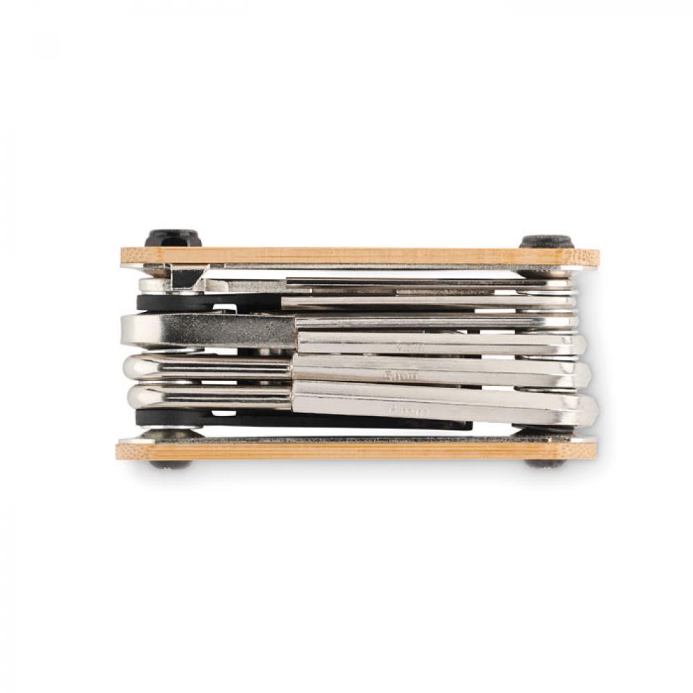 Многофункциональный карманный набор инструментов из нержавеющей стали в бамбуковом корпусе. 11 инструментов. В комплект входят: шестигранные ключи, плоский ключ, удлинитель, крестовая отвертка и торцевой ключ.
