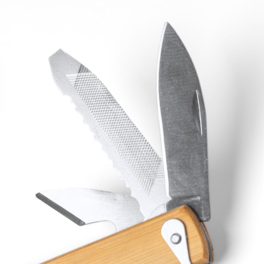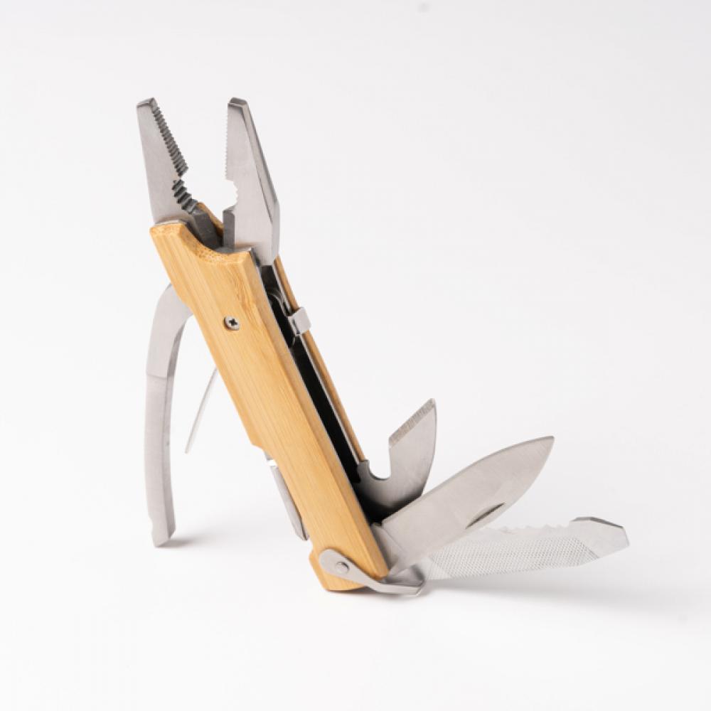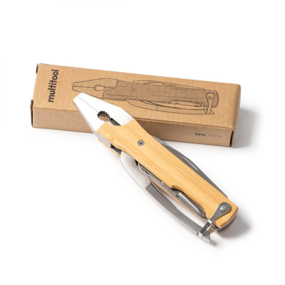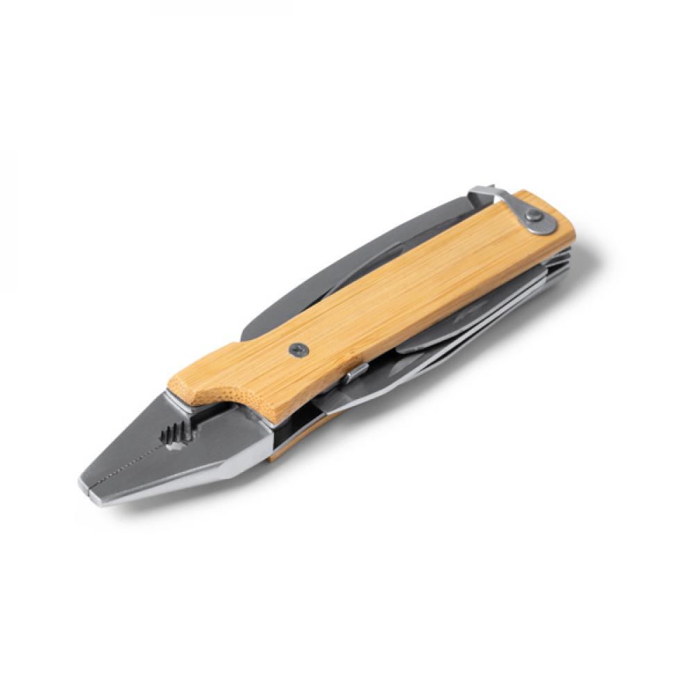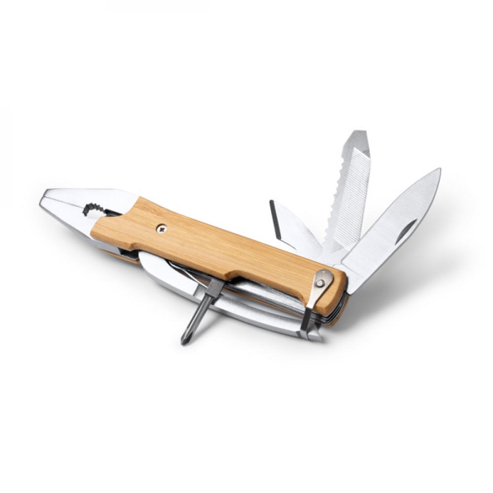 Многофункциональный инструмент из нержавеющей стали с рукояткой из бамбука. 5 функций: бритва, пила, кусачки, открывалка и отвертка. Представлен в экологически дизайнерской коробке.