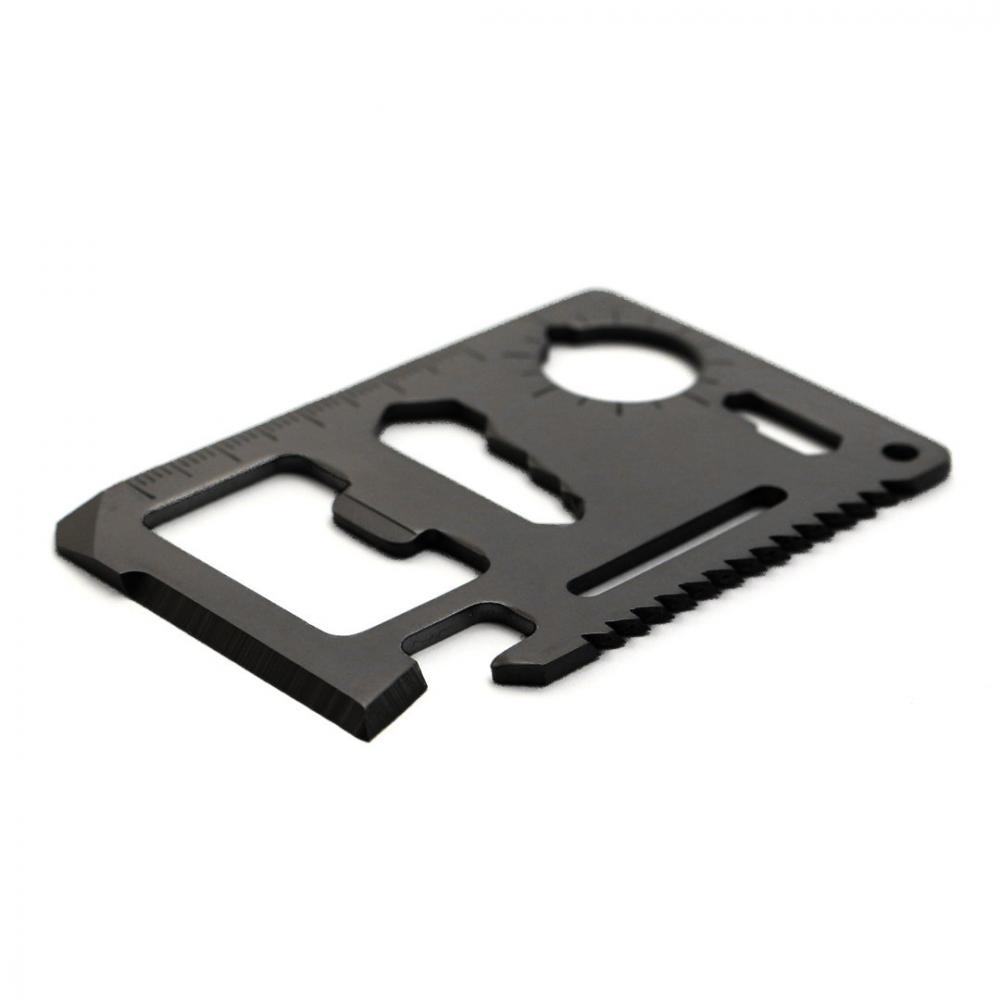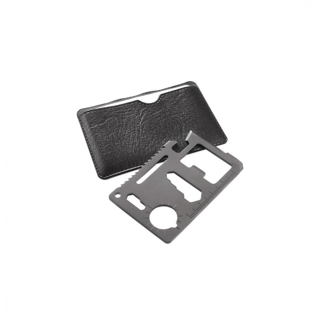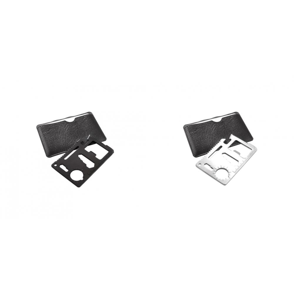 Особенности Многофункциональный инструмент с прочным корпусом из нержавеющей стали с 11 функциями. С консервным ножом, отверткой, линейкой, открывалкой для бутылок, открывалкой для бутылок, гаечными ключами, ключами-бабочками, пилой и указателем направления. Представлен в прочном кожаном футляре. 11 Функций нержавеющая сталь