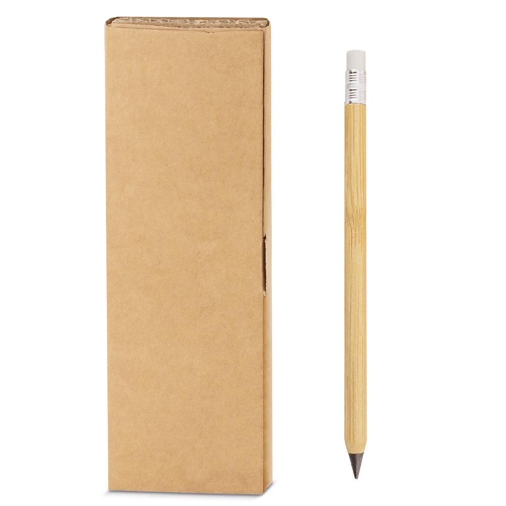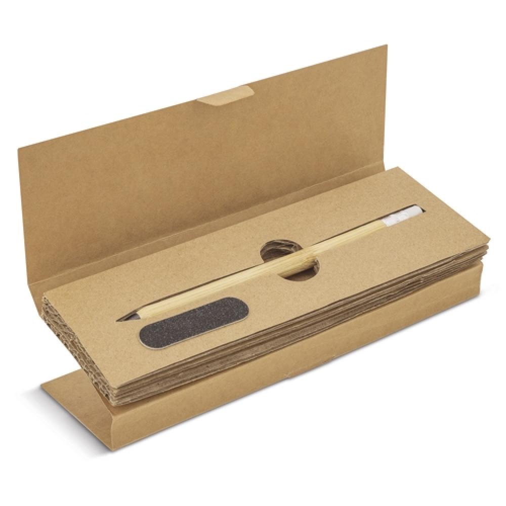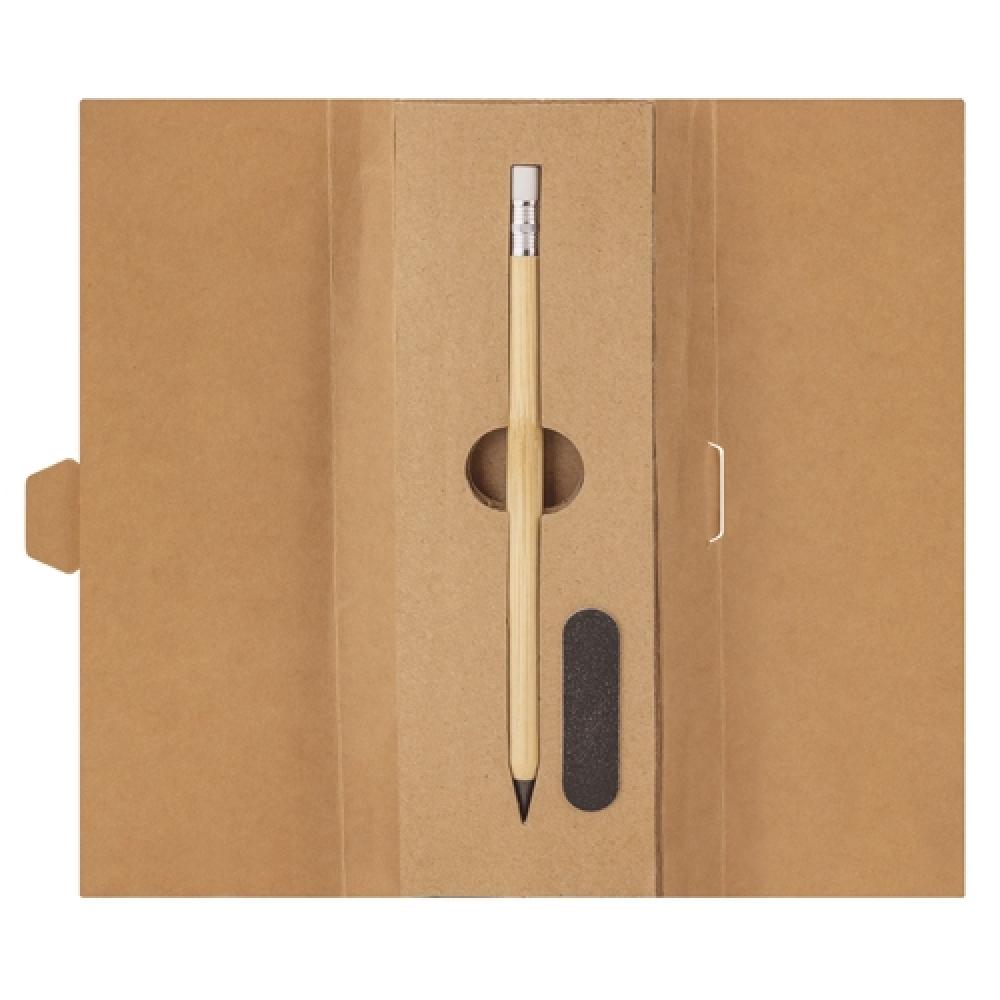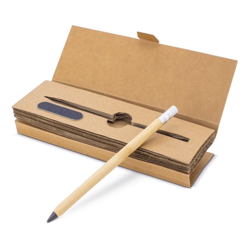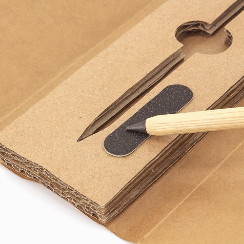 Набор из переработанного картона, состоящий из бесконечного карандаша из бамбука и резины, не оставляющего остатков, и точилки, чтобы затачивать кончик и всегда держать его как новым.