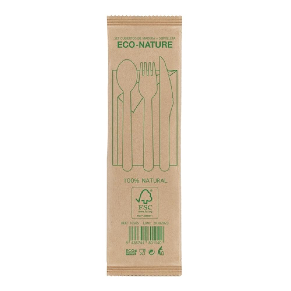 Набор экологически чистых столовых приборов, изготовленных из древесины устойчивых источников. Включает вилку, нож, ложку и салфетку (продается кратно 500).
