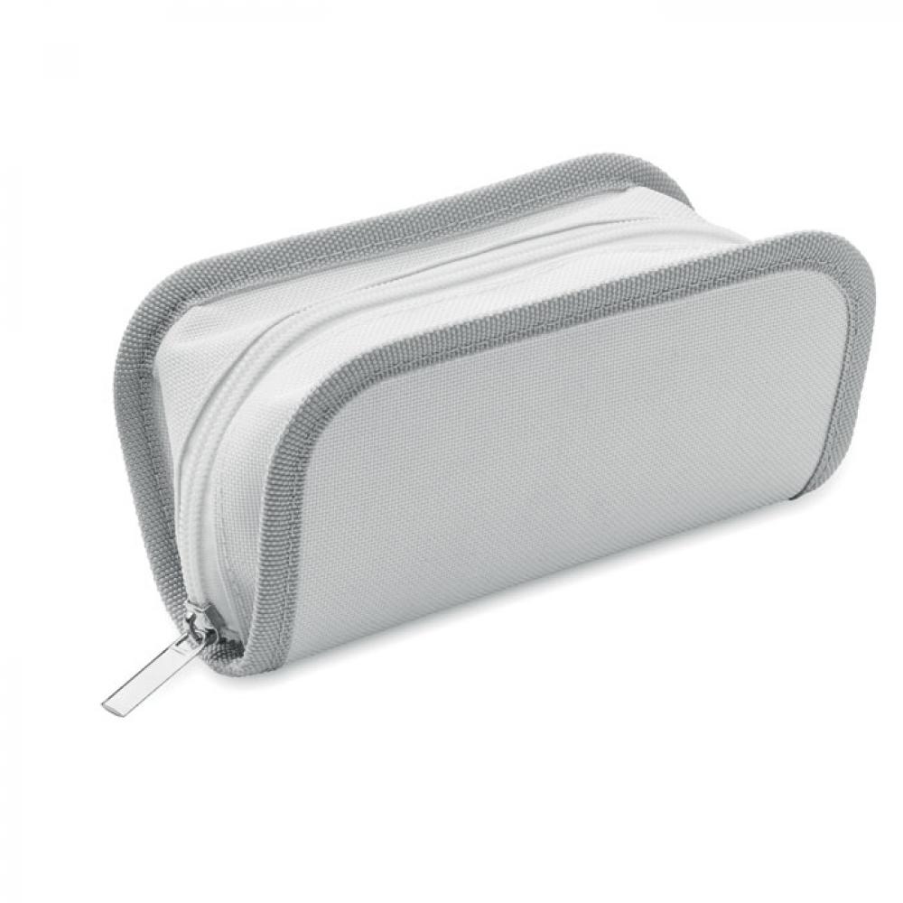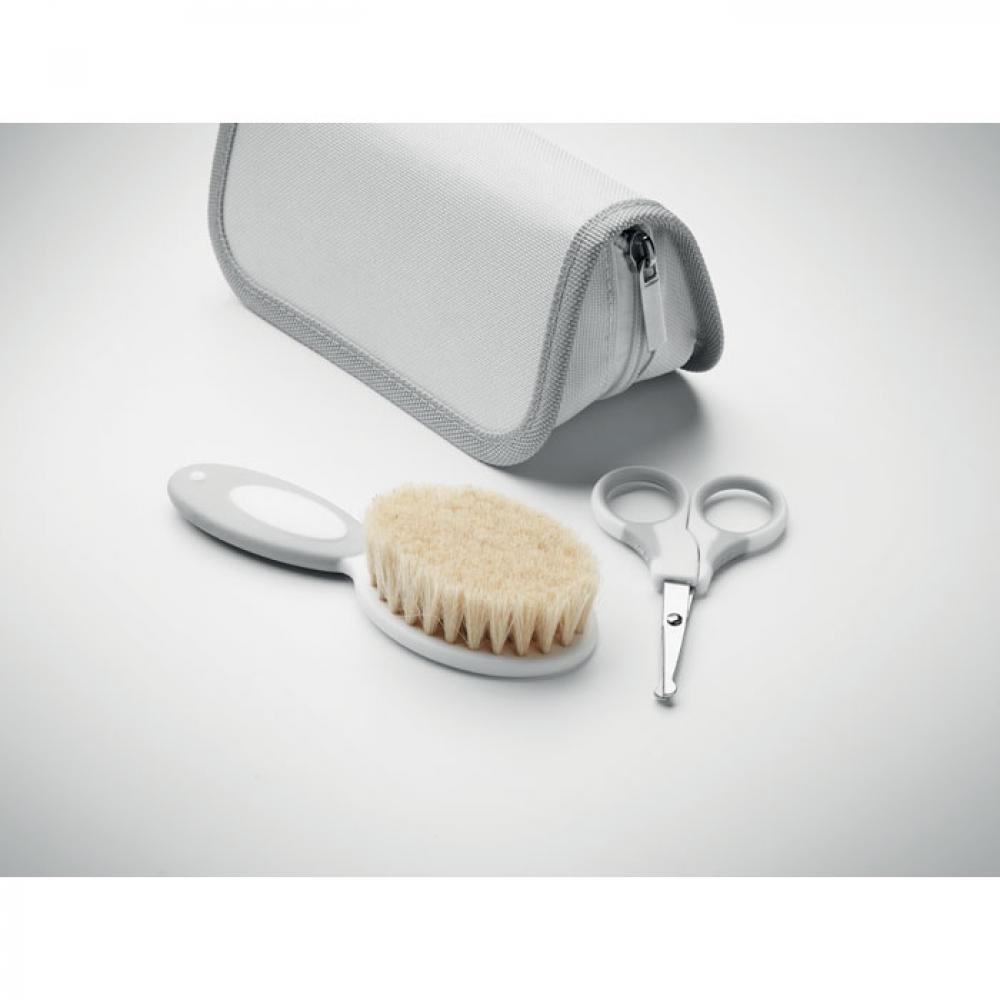 Набор для ухода за ребенком из 6 предметов. В набор входят: щетка для бережного ухода, детская расческа, назальный аспиратор, пилка для ногтей, кусачки для ногтей и ножницы. Поставляется в сумке из полиэстера 600D.