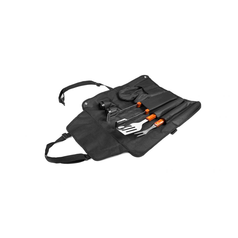 Особенности Набор для барбекю из 7 аксессуаров. В комплект входит поддон, траншеекопатель и зажимы из нержавеющей стали с деревянной ручкой. С мягкой варежкой и баночками-дозаторами для соли и перца. Представлен в прочном корпусе из полиэстера 600D черного цвета с металлической застежкой на пуговицы. С регулируемым ремнем для переноски и застежкой на пряжку из прочного нейлона. 7 Аксессуаров