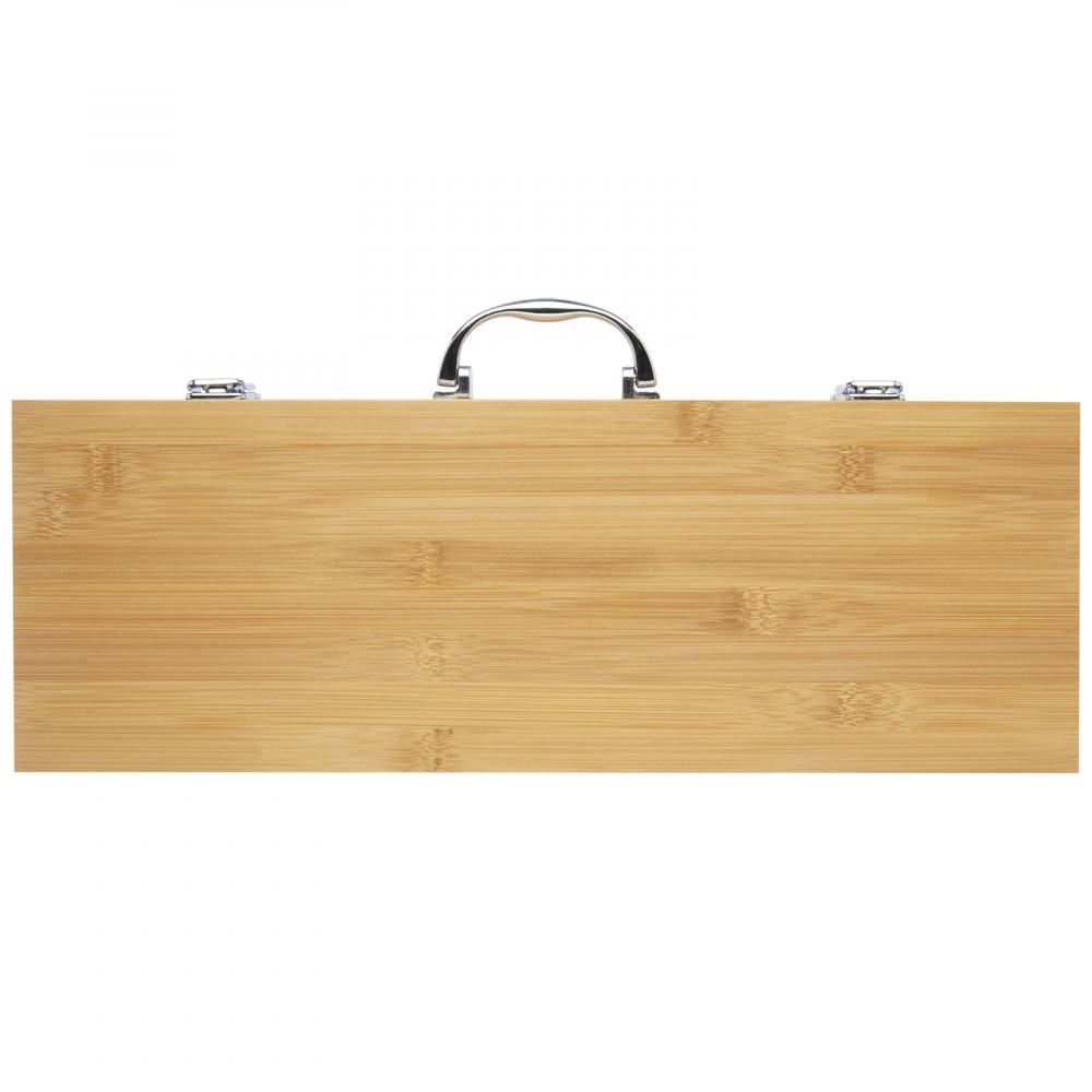Набор для барбекю из бамбука, состоящий из 5 предметов: лопатка (40 x 9,5 см), щипцы (34,5 x 6 см), вилка (38,5 x 3 см), нож (38,5 x 3 см) и кисточка (38 x 4,3 см). Набор поставляется в подарочной коробке из бамбука (46 x 16,2 x 7,4 см). Ручки и подарочная коробка изготовлены из бамбука, который был получен и произведен в соответствии с устойчивыми стандартами.