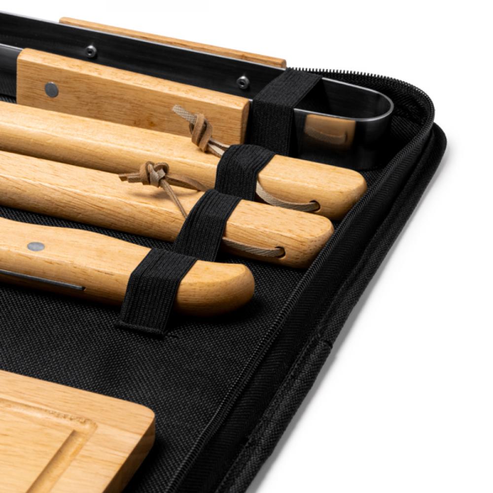 Набор для барбекю. Включает 4 нержавеющих стальных аксессуара с деревянной ручкой: нож, резак, щипцы, лопатка и деревянная разделочная доска. Представлен в чехле из переработанного полиэстера RPET.