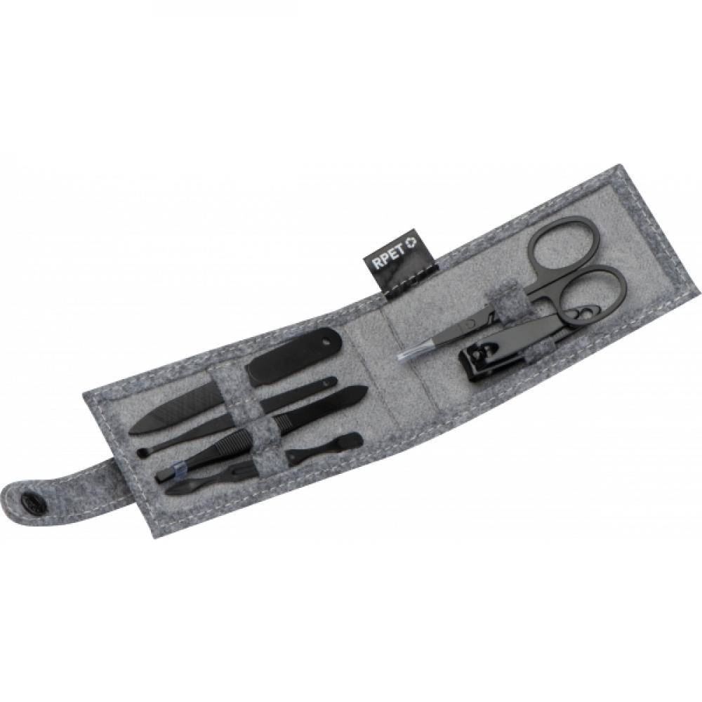 Привлекательный набор для маникюра, изготовленный из фетра (переработанный ПЭТ). Включает ножницы для ногтей, пилочку для ногтей, кусачки для ногтей, пинцет и два пушера для кутикулы.