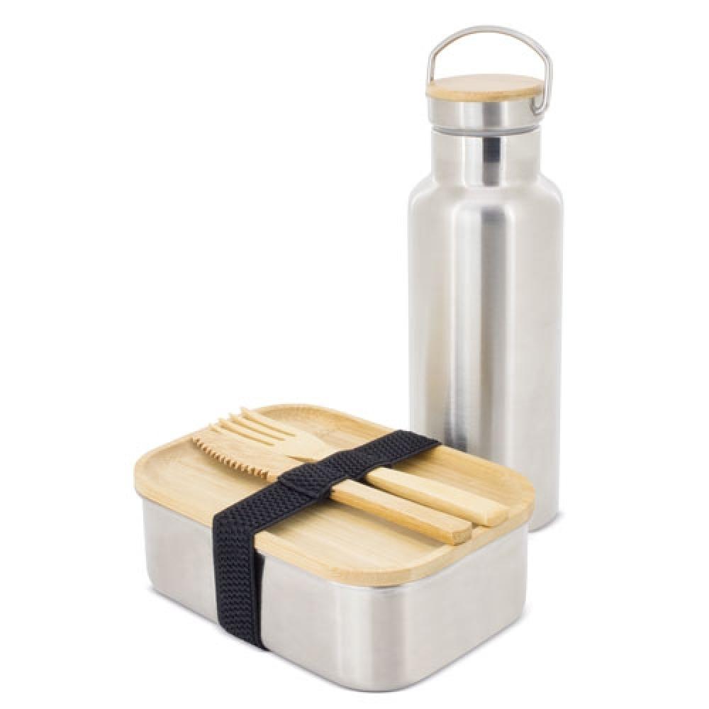 Набор для обеда, включает ланч-бокс (размер 16.5*11.5*5.9 см), нож, вилку и бутылку объемом 500 мл. Все изделия изготовлены из бамбука и нержавеющей стали.