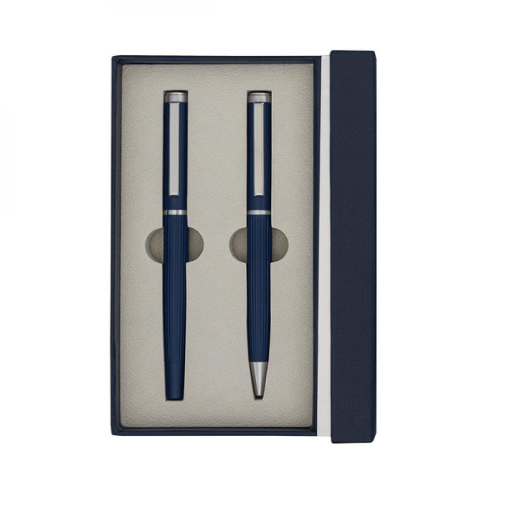 Набор, состоящий из металлического шарикового и роллерного ручек. Синий стержень. Упакован в элегантную подарочную коробку.
